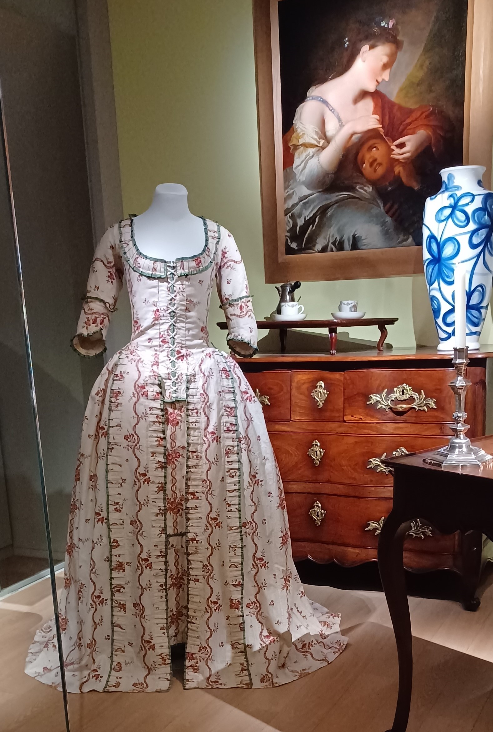This dress appeared to be made from printed cotton, which had been forbidden in France between 1686 and 1759. According to the Metropolitan Museum of Art, printed cottons (chintz) were seen as a threat to the domestic silk weaving industry, so silk producers petitioned the government to ban them. Legislation was passed in 1686 prohibiting the importation and domestic production of printed textiles. For a more in-depth study on this topic, check out this BBC article: The Floral Fabric that was Banned