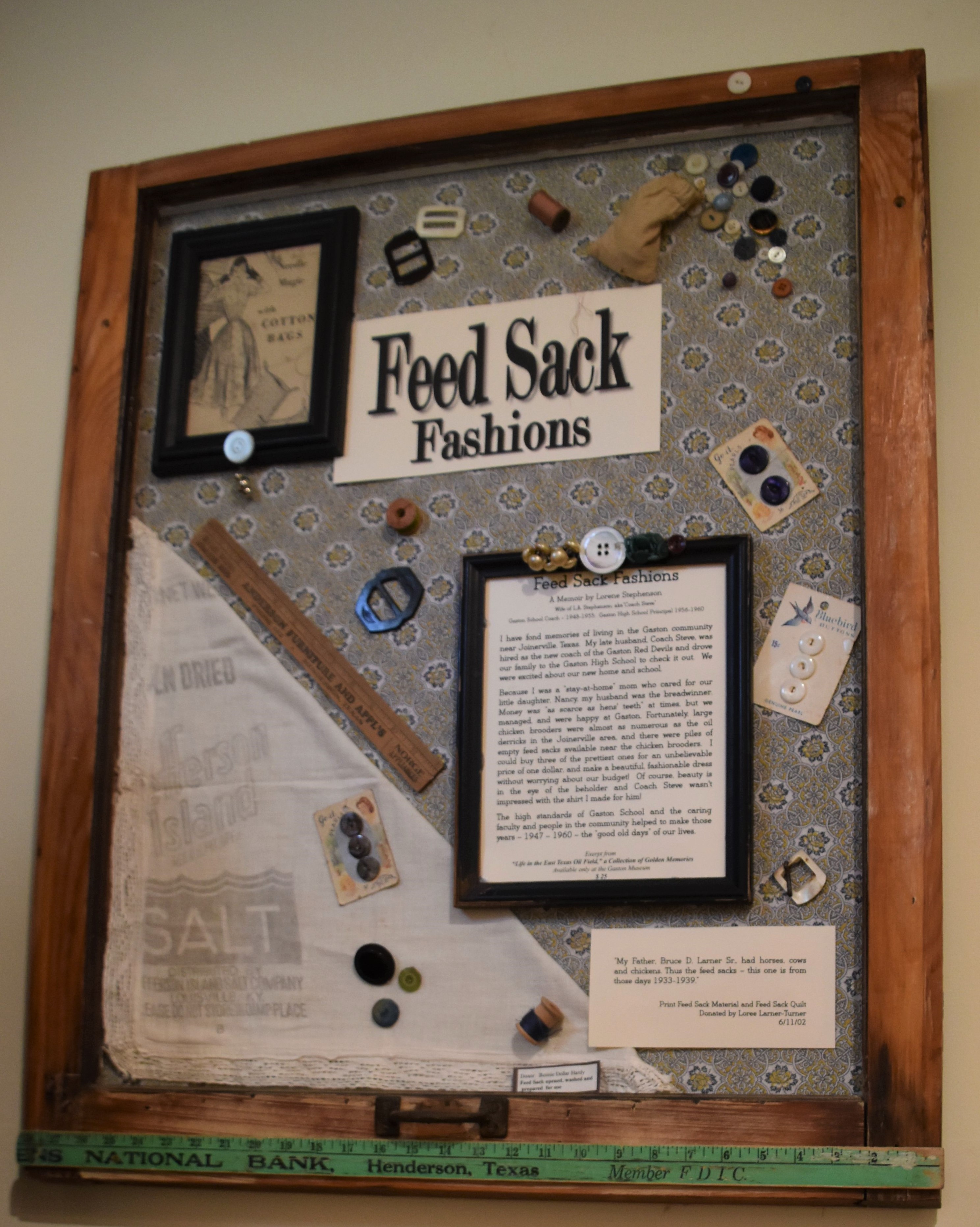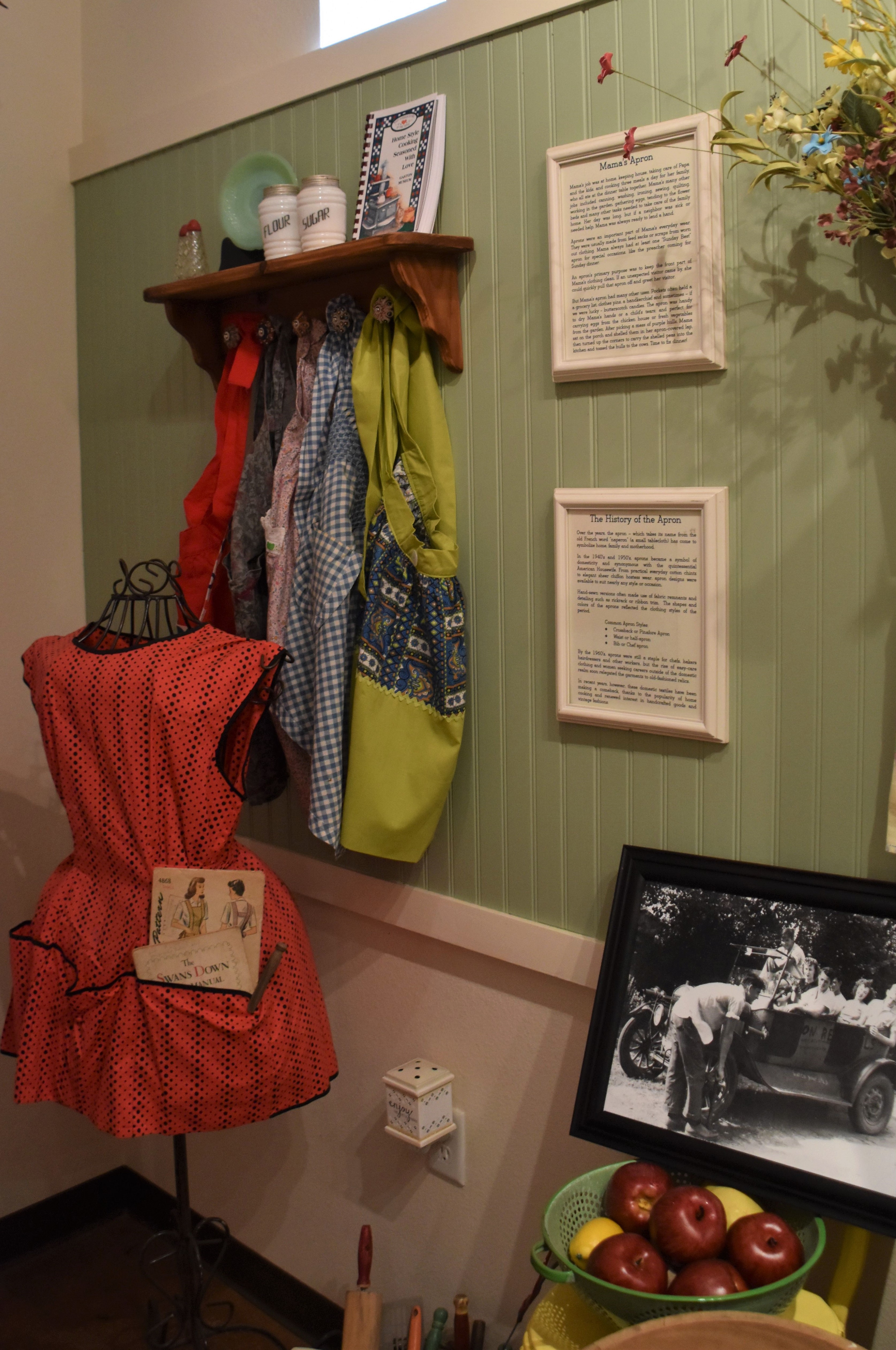 The newly-renovated museum begins with objects from the gas station. It continues to a large area depicting home life and the school's home economics class, including a display about making clothes from flour sacks, a row of aprons, and period glassware.