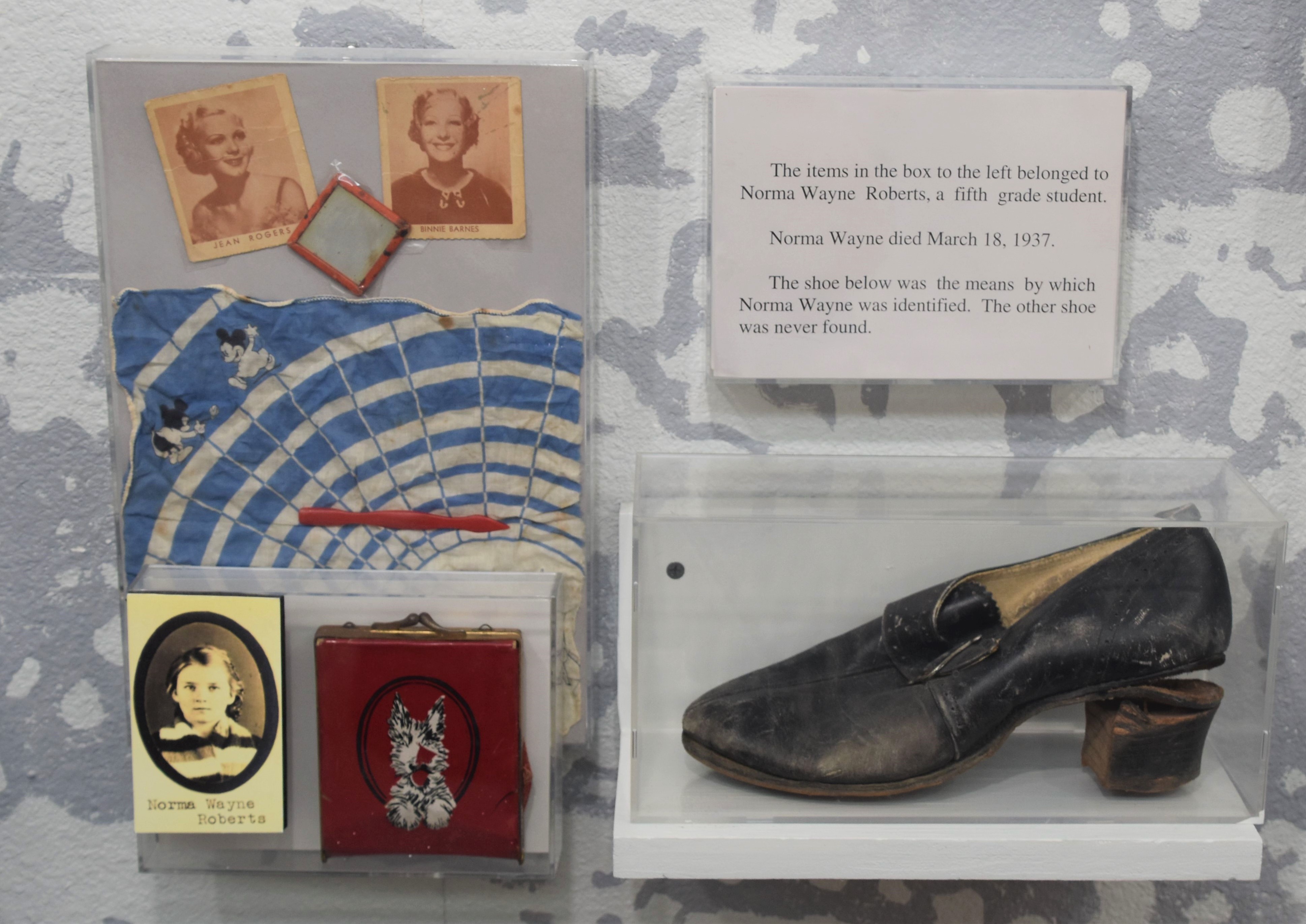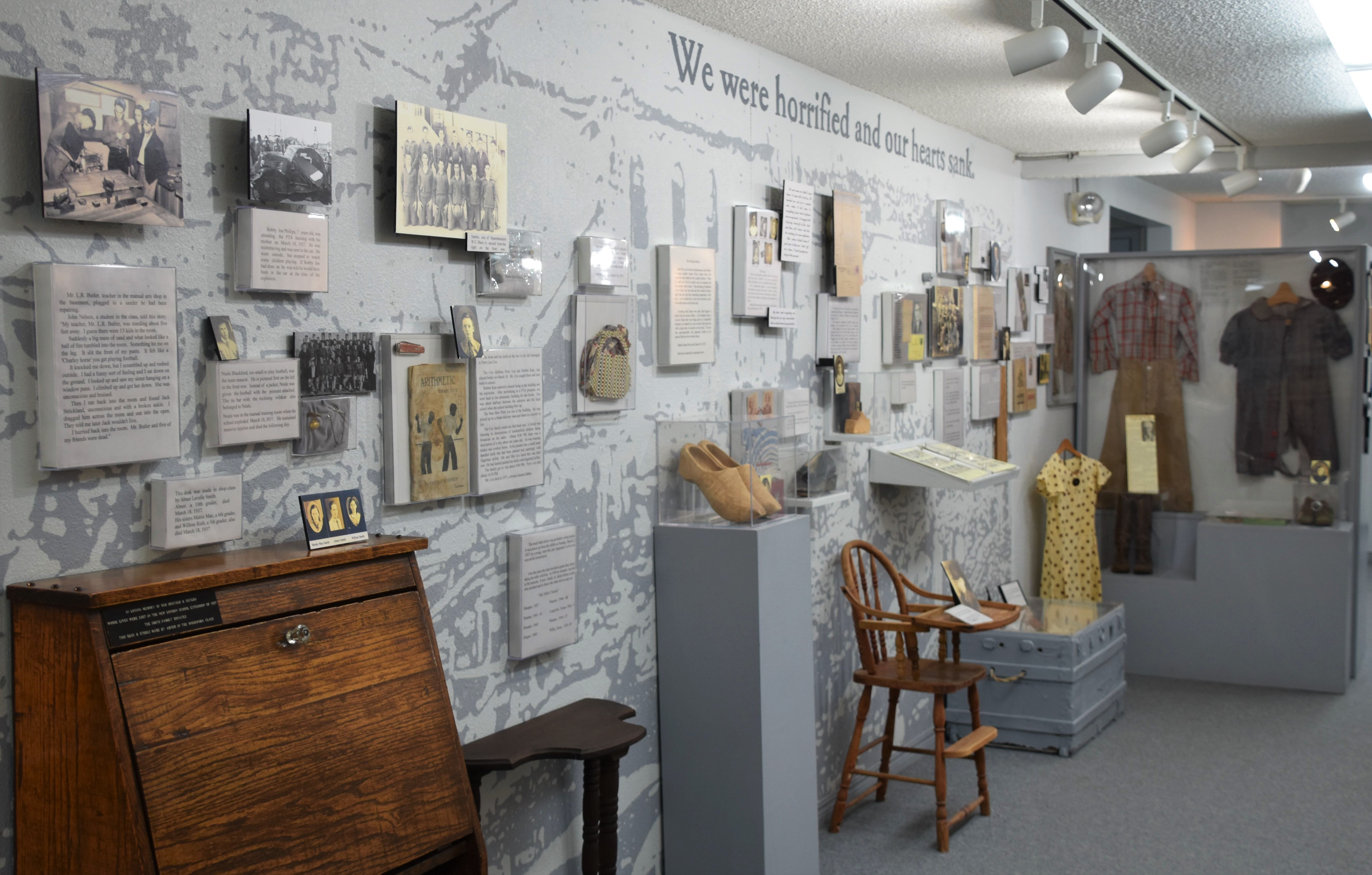 Along one wall of the museum are facsimiles of newspaper headlines. The opposite wall exhibits personal items of some of the victims donated by their families.