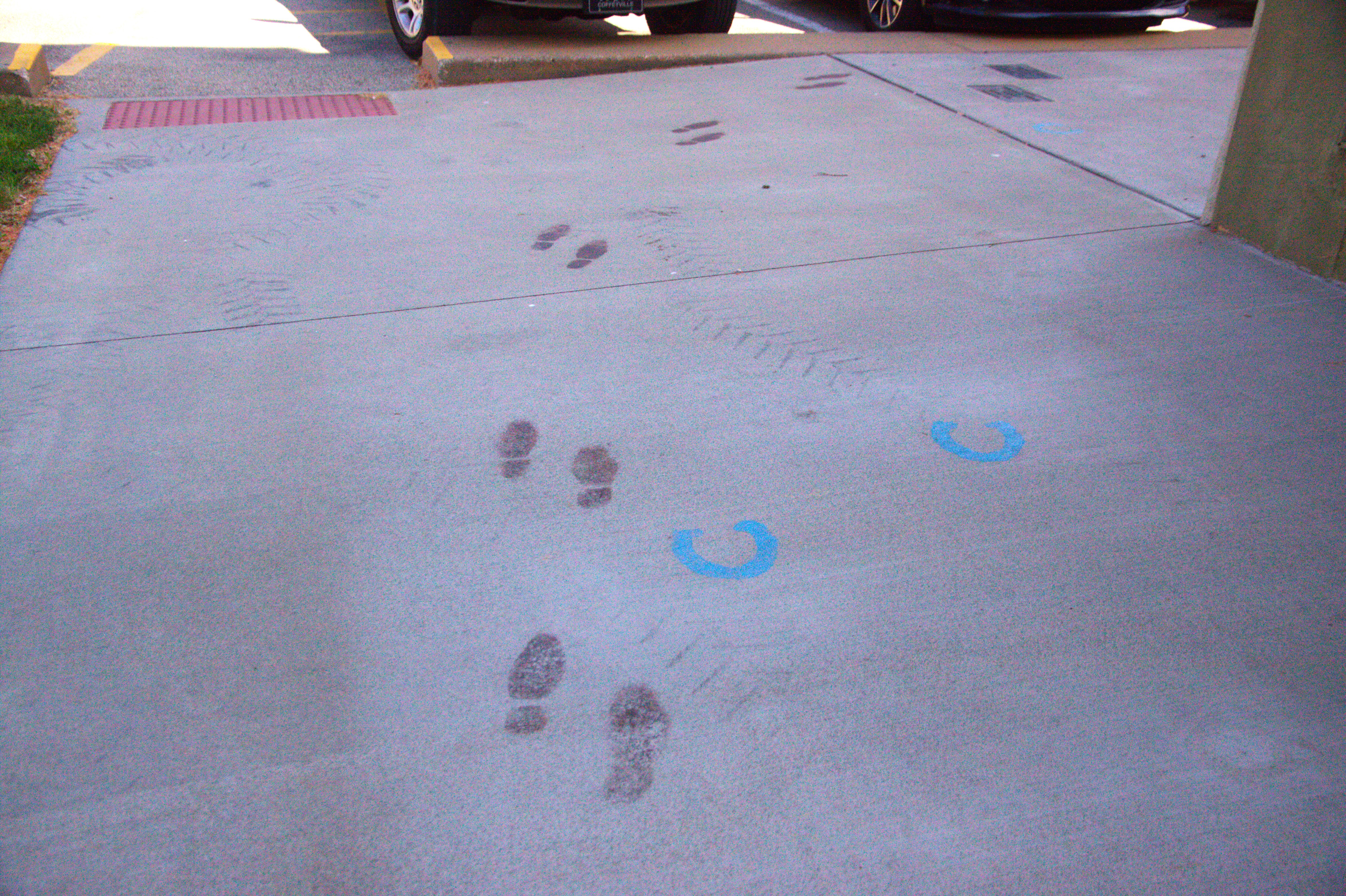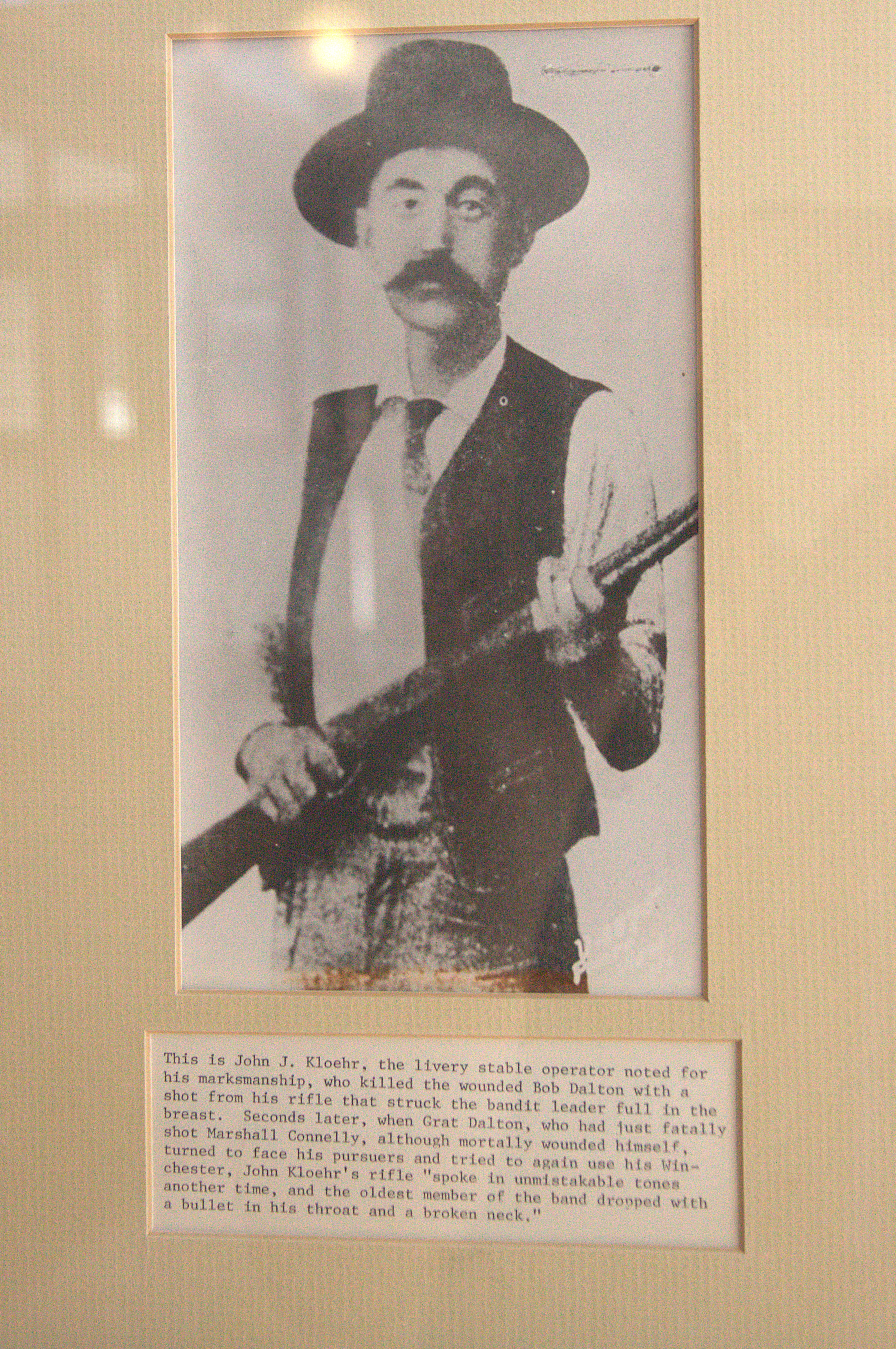Just alongside the defender’s museum here on the ally floor is the outline (in blue paint) of horseshoes and footprints (brown paint). Grat Daltons body is outlined in blue paint and named where he was gunned down and killed near the old jail, also outlined and named is that of his brother Bob which is close to the entry door of the raider museum. Both were dispatched by local sharpshooter and hero John J. Kloehr
