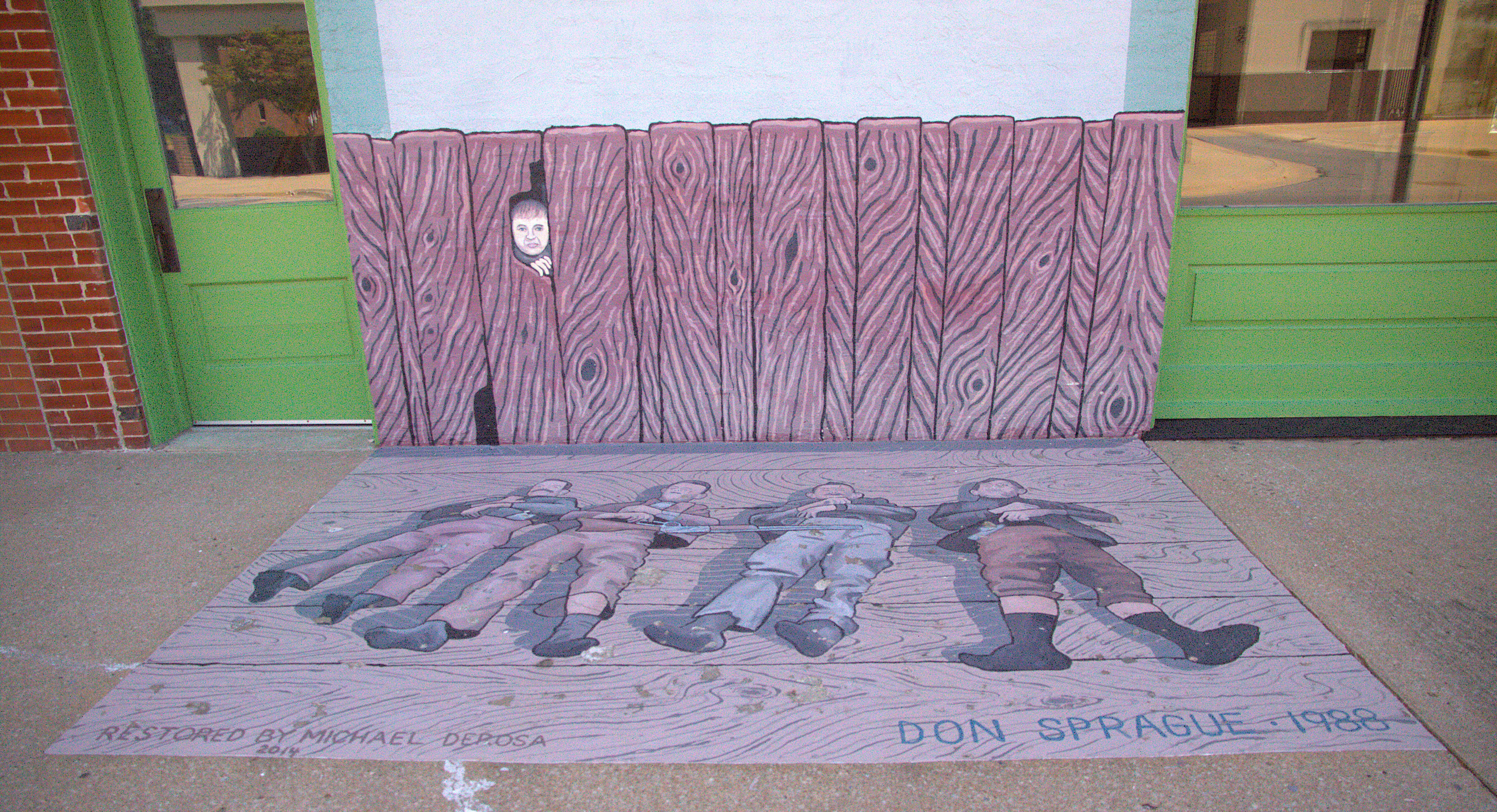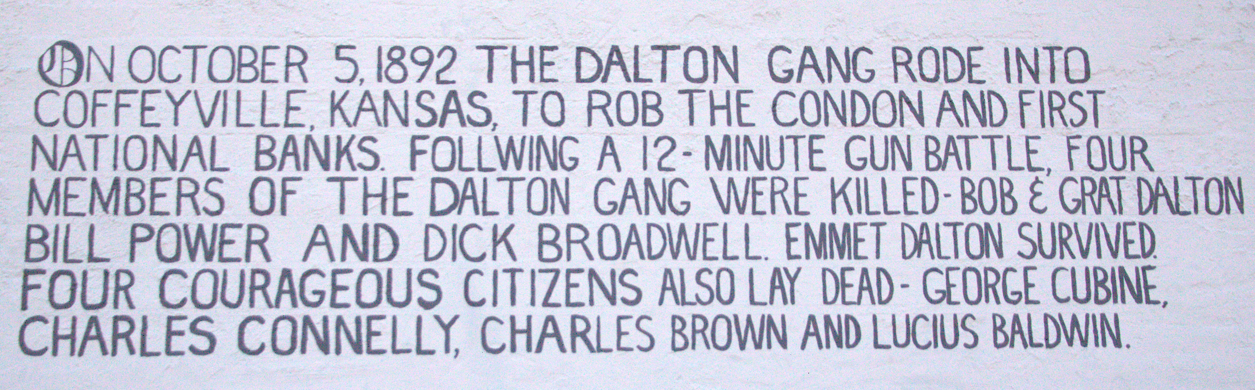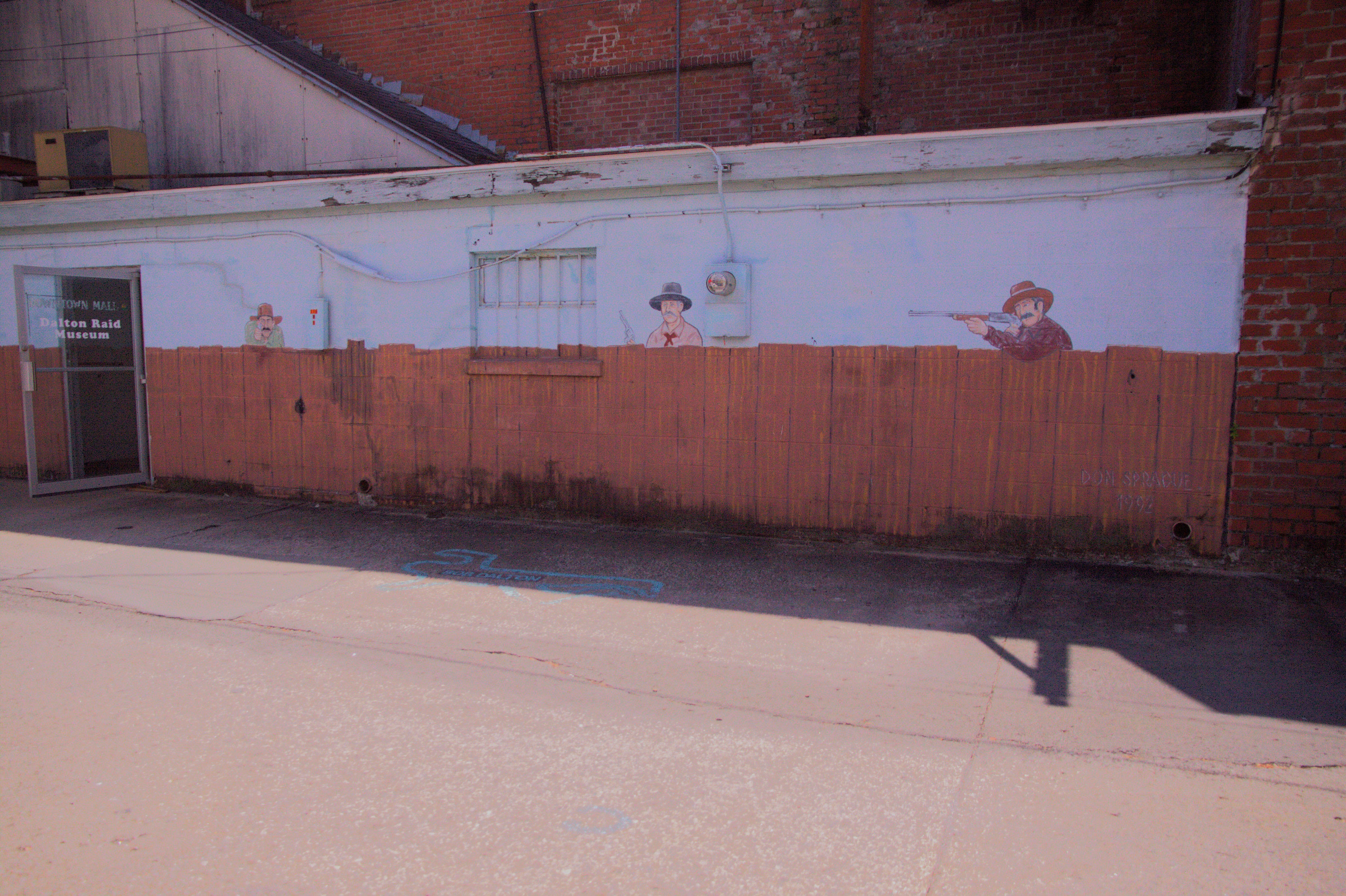 There was ample parking on S. Walnut, so once that was done, we headed to the C.M. Condon Bank, scene of one of the two Bank raid attempts by the Doolan gang on October 5th, 1892. It was a grand looking building coloured light grey and pale green. Walking around the corner was a painted mural. On the wall was an image of a plank fence with a knothole through which a young boy peered while below on the walkway the four slain Dalton gang members appeared laid out, displayed for all to view.