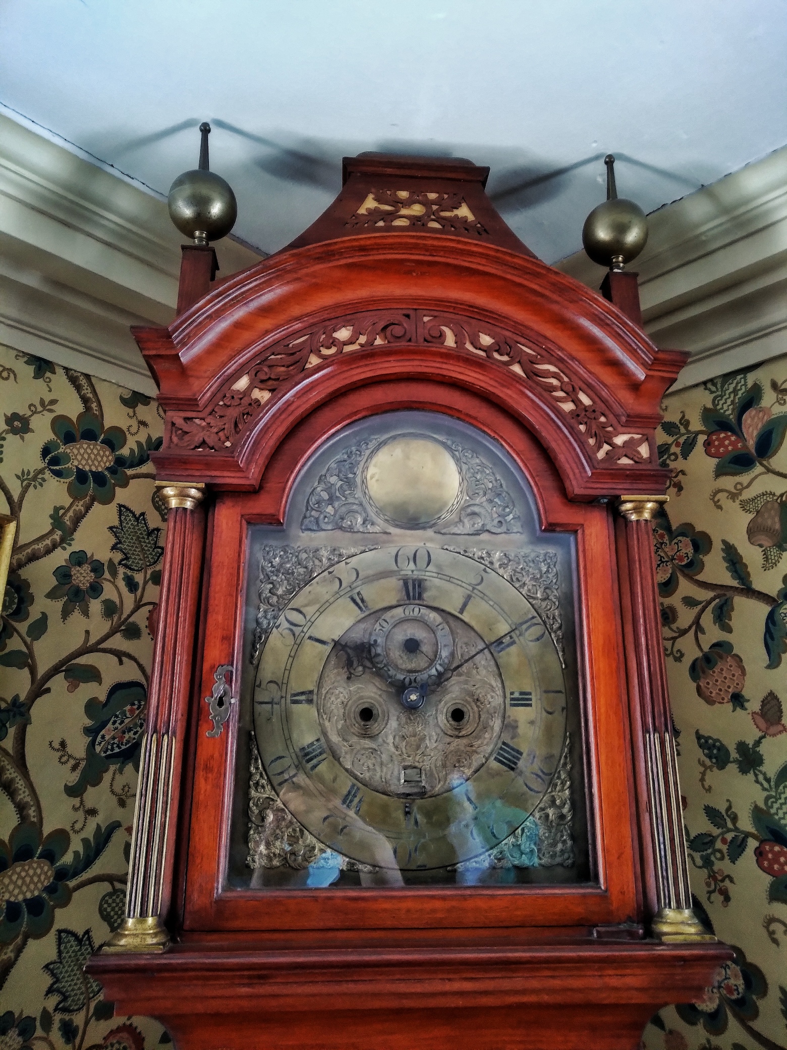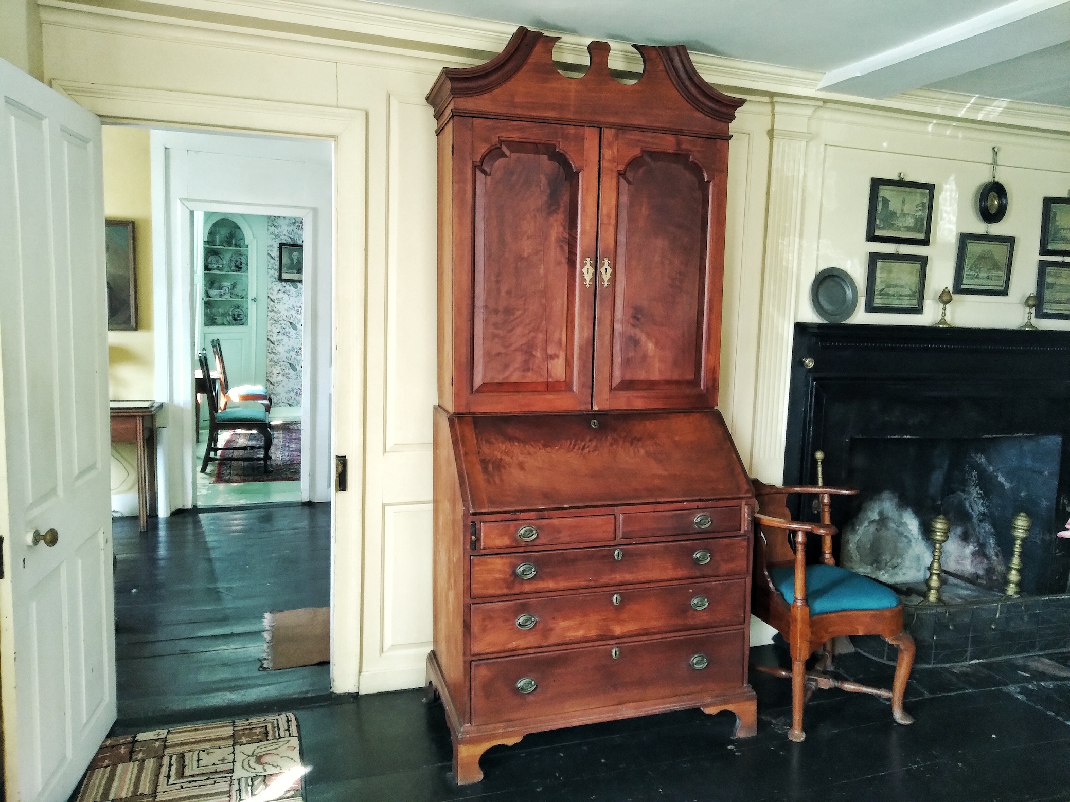 As for the homeowners, their fortunes wavered during the Jefferson Embargo of 1807, a disastrous prohibition on purchasing foreign goods enacted by third US President Thomas Jefferson. Regular readers of my posts may remember that the same disaster befell other wealthy merchant families whose mansions were eventually owned by HNE, including Hamilton House, Castle Tucker, and Nickels-Sortwell House. The family was well-connected despite years of financial insecurity and mortgaged the house to the Lyman family, owners of HNE’s Lyman Estate. As early as the 1820s, family members took inventory of their antiques and gave tours of the property, starting a tradition that likely led to the house becoming a museum. My favorite of these antiques was a floor-to-ceiling writing desk that was too big to fit in the room, so the top few inches of the wooden decoration were chopped off. A similar fate happened to the finial of a tall clock.