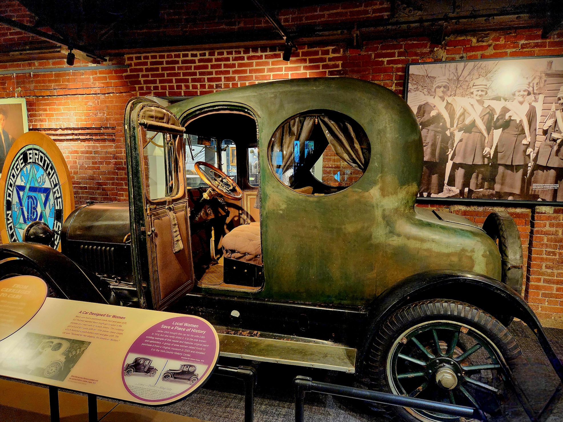 The Pullman car—an automobile, not a train—intrigued us because it was “Tailored for Her Majesty the American Woman.” In 1916, cars still had cranks to start them and gear shifts. Pullman was concerned that ladies’ dresses could become entangled in those mechanics, and designed the Deluxe Opera Coupe with push-button gear shifts and starting systems. It even had a privacy screen so that a lady could change clothing, presumably before attending the opera.