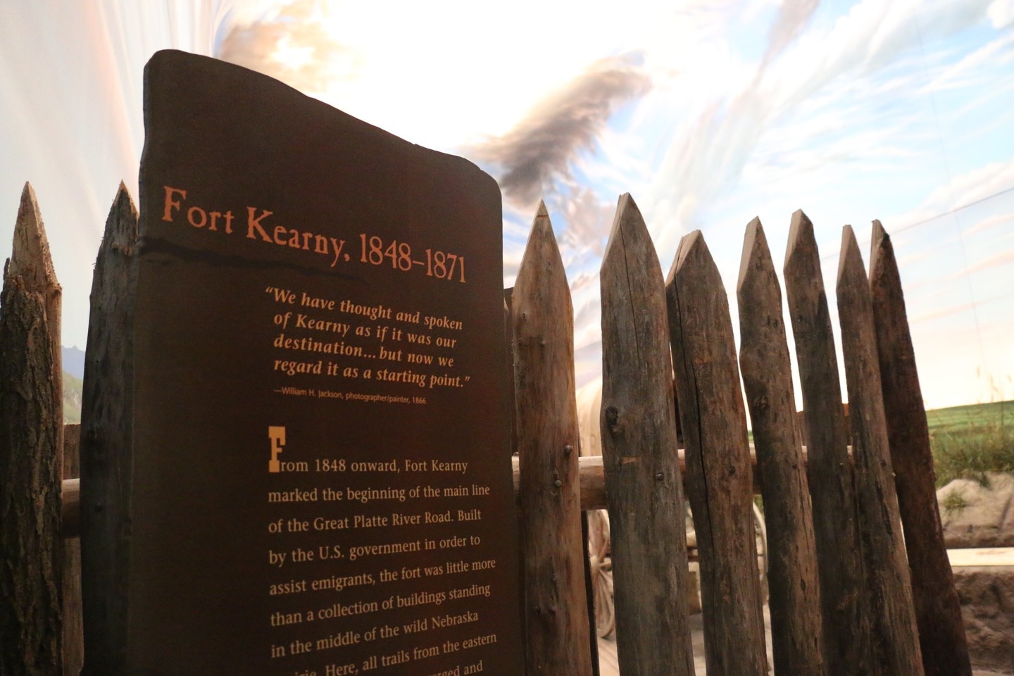 For example, right when you enter the exhibit, you’ll notice a re-creation of Fort Kearny, a military base established in 1848 to protect and resupply Oregon Trail travelers (the site is now a state historical park and is located near The Archway). Flip to the audio track, and you’ll learn all about the fort’s purpose and history as you gaze inside. Move a little further, and you will come across a covered wagon with life-sized pioneer figures, and you can stop here to listen to the stories of real emigrants from that time period. Also, don’t be startled by an impromptu thunderstorm, complete with dimming and flashing lights and thunder sound effects, or a stampede of buffalo that simulate just a bit of the harrowing atmosphere these pioneers endured as they trekked across the country. All of this is against the backdrop of scenically illustrated walls that give the impression of the endless plains, an encampment of the Mormon migration or towering bluffs. It’s multi-sensory elements like these that make for an immersive learning experience, regardless of how much you know about the time period coming in.