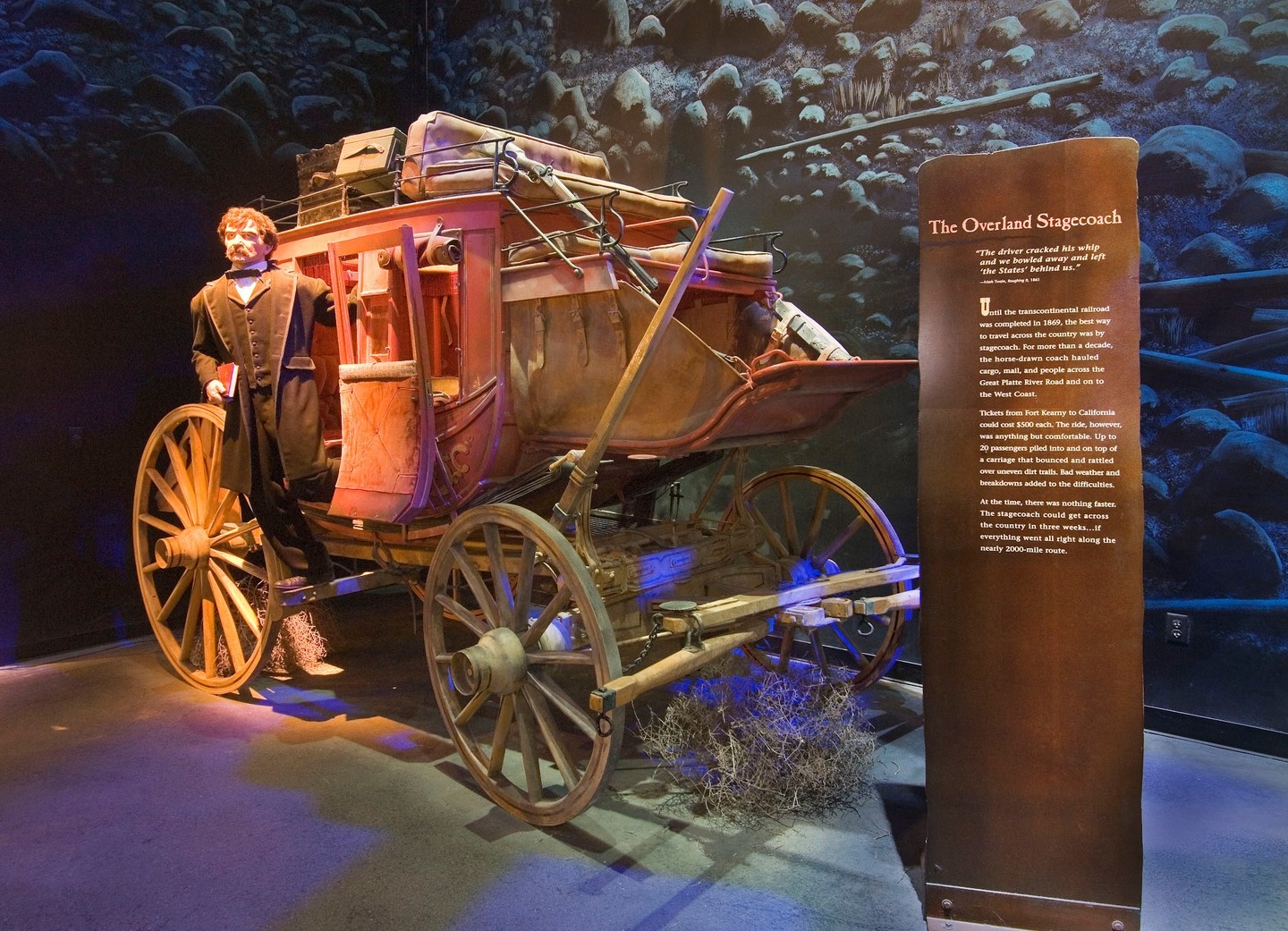Part of The Archway’s story is the story of technological innovation. It features material on means of travel that soon lost their relevance and died out, including stagecoaches (with a guest appearance by literary giant Mark Twain) and the Pony Express, the short-lived but famous transcontinental service that used a network of riders from 1860-61 to get mail from one end of the country to the other. Both soon lost viability with the invention of the telegraph and the expansion of the transcontinental railroad (completed in 1869), which is also integral to Nebraska and The Archway’s story.