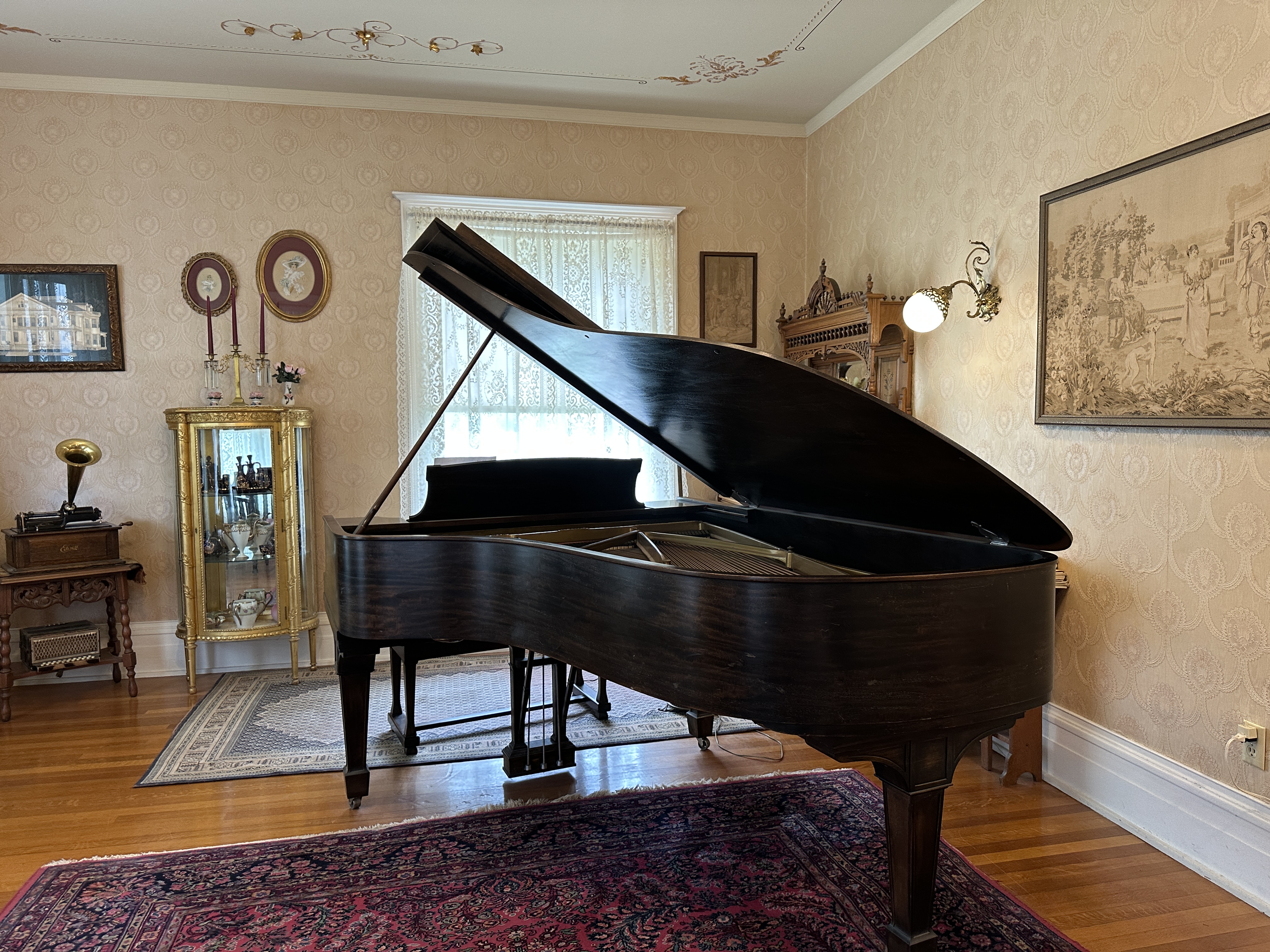 The music room houses a magnificent 1920 Steinway grand piano, personally selected by Mr. Steinway himself, alongside a 1905 Edison Cylinder Phonograph. Mahogany woodwork and gold-painted finishes throughout the mansion create an atmosphere of refined opulence that transports visitors to another era.