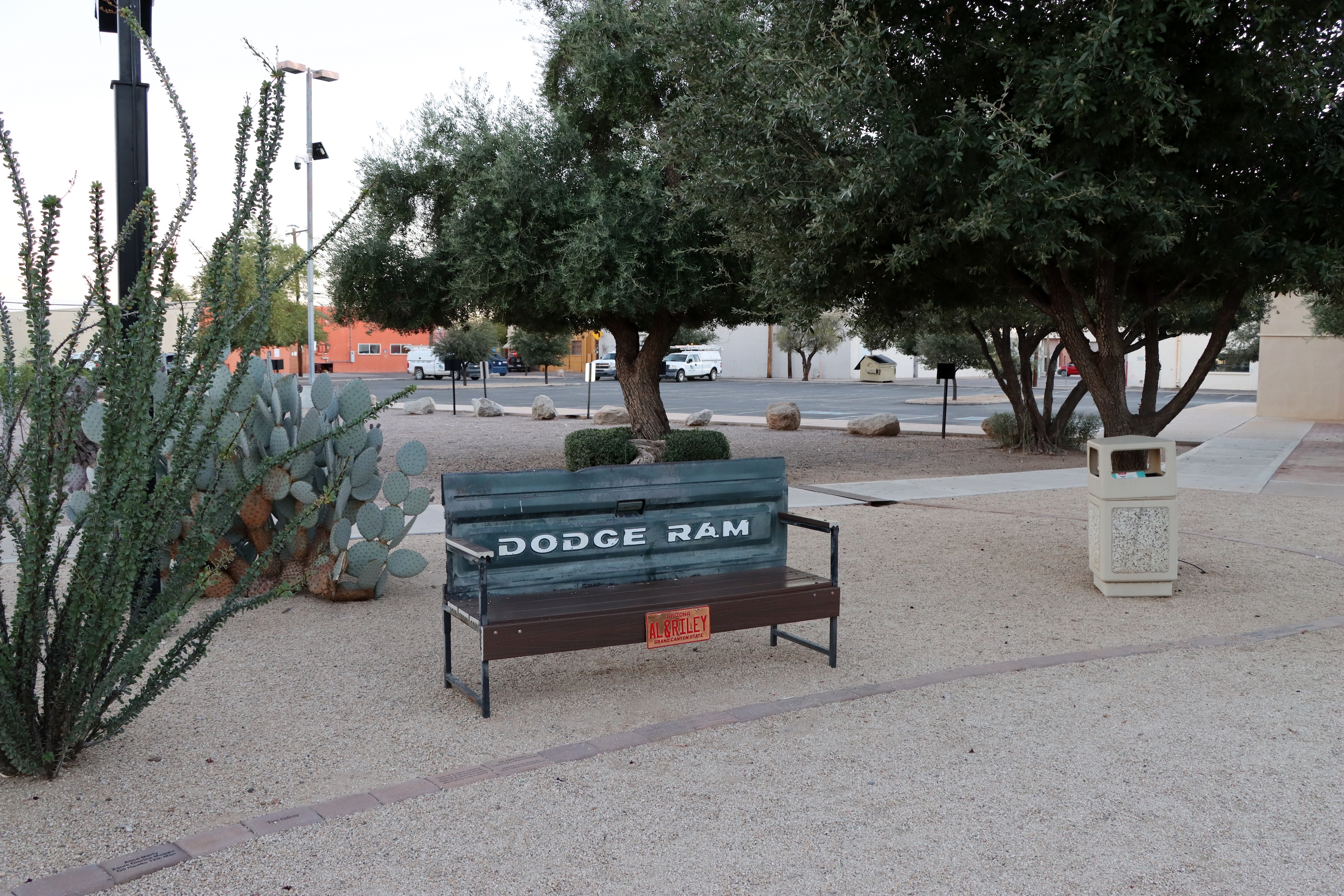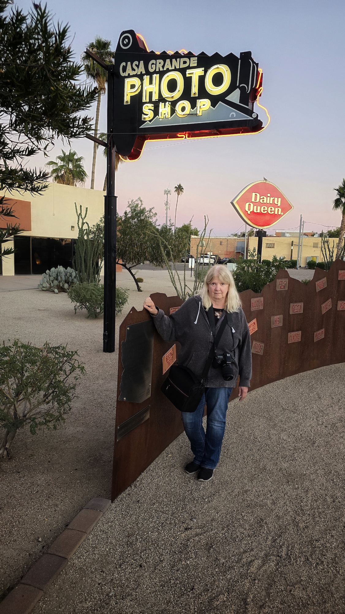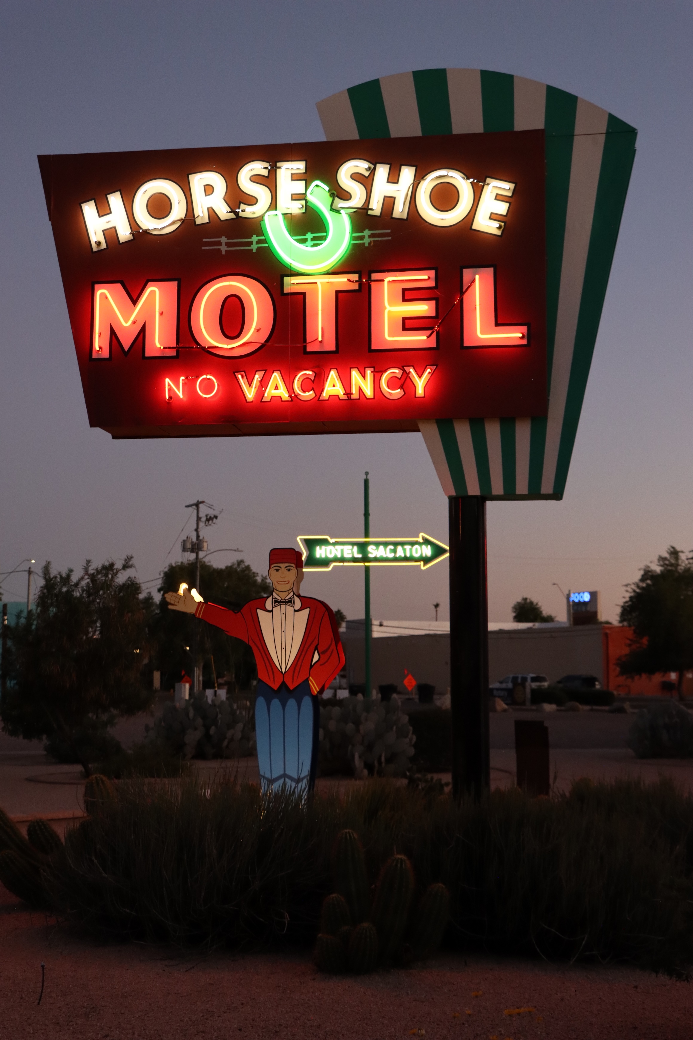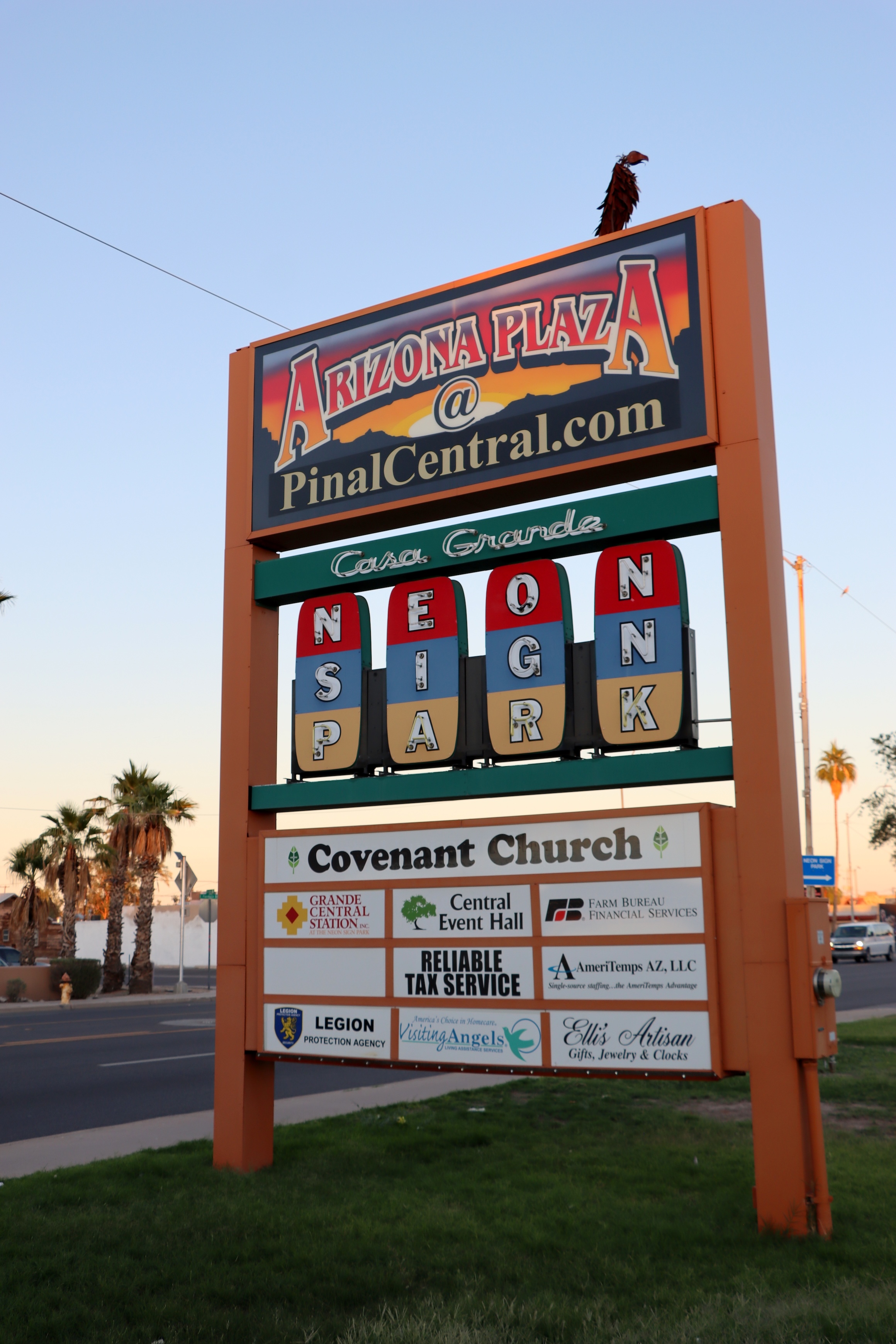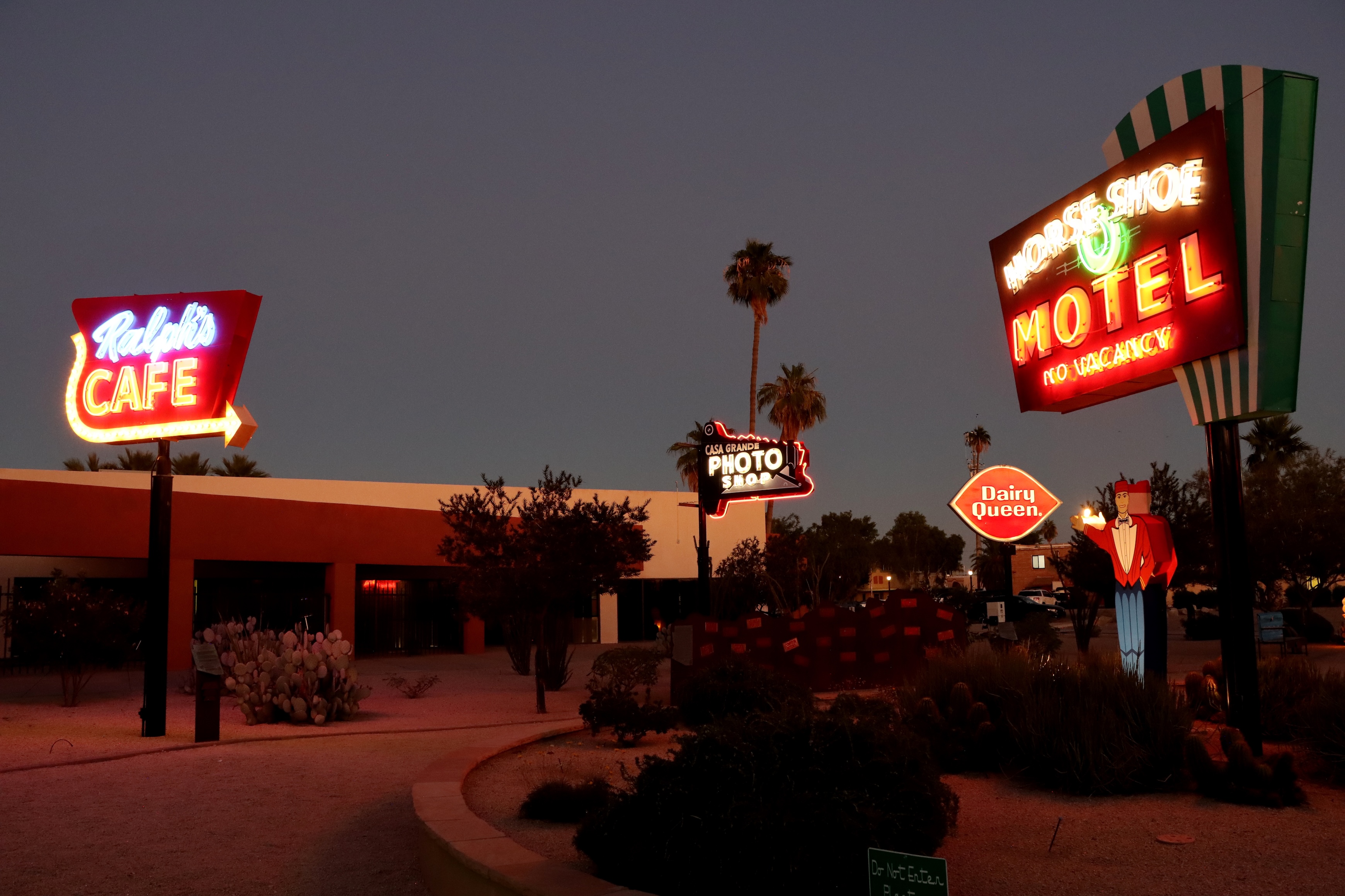 The three of us learned that these historic neon signs were collected over the years, starting in 2004, when Marge Jantz, executive director of Casa Grande Main Street, and Thom Poor, the beloved volunteer mentioned above, rescued the Horse Shoe Motel sign as the building was being demolished. That sign was stored for the next 14 years before serious fundraising efforts began. There was also a National Historic Preservation Contest announced in 2017. Voting lasted 35 days, with 25 cities across the country competing for grant money. Casa Grande finished 2nd in the country. They received $144,000 to help turn Jantz’s vision, which had spread rapidly through the community, into reality. By January 31st, 2020, $226,171 had been contributed, along with the loaned property, which would serve to showcase the outdoor sign museum.