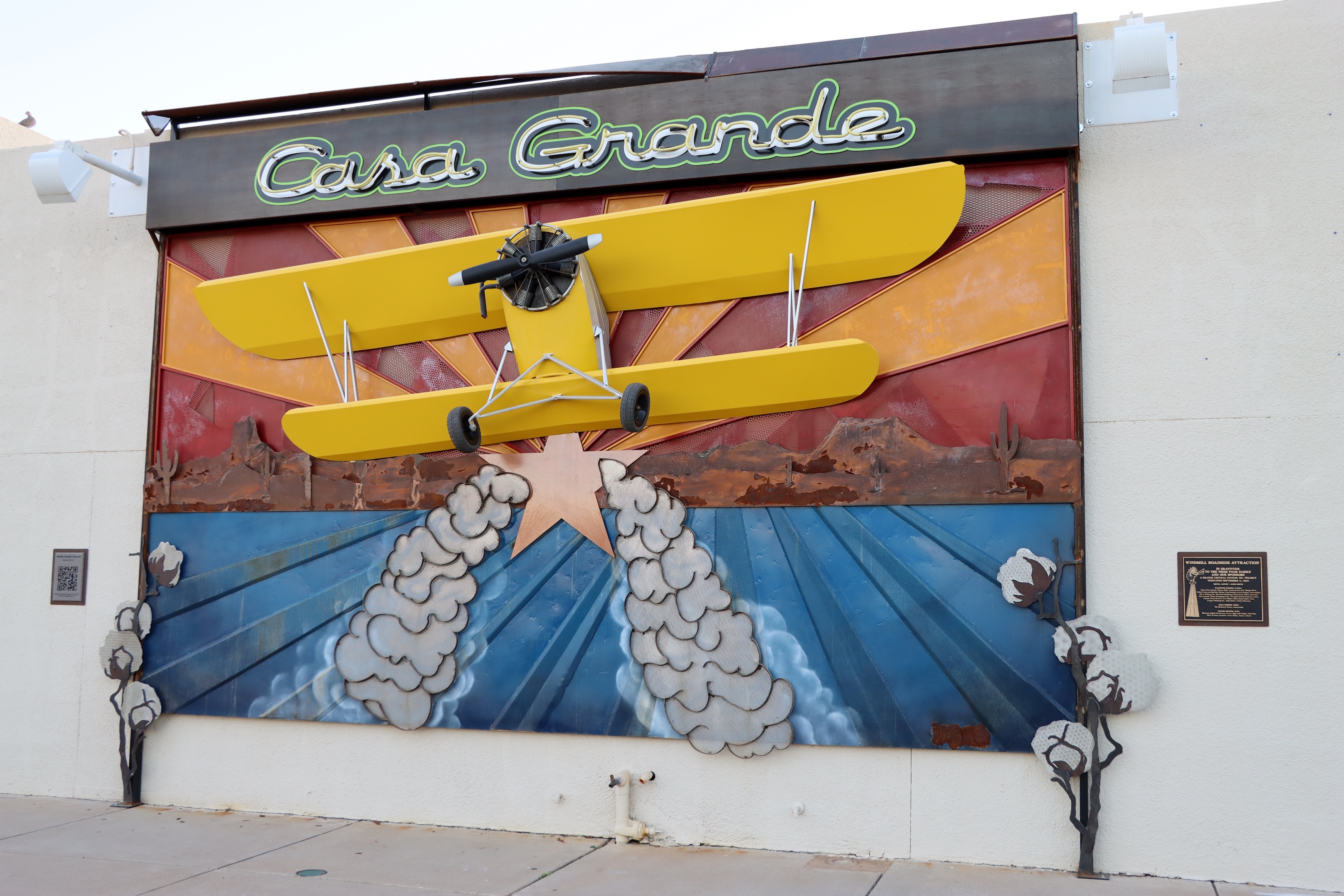 There’s a wall display featuring farm artifacts, metal cows, and an outstanding crop duster art piece designed by a local metal artist named Josh Smith. He did a great job highlighting the importance of the farming industry in Arizona.