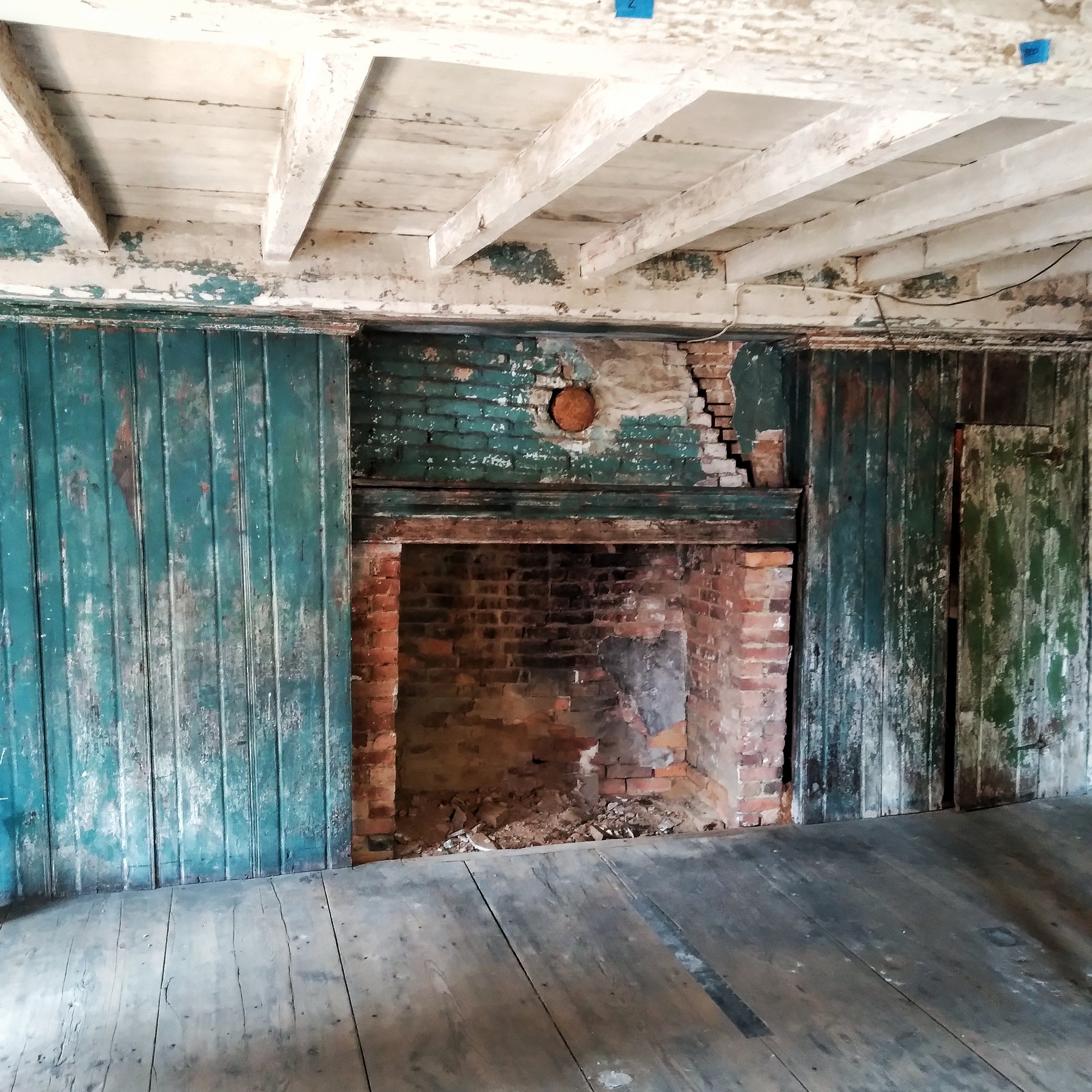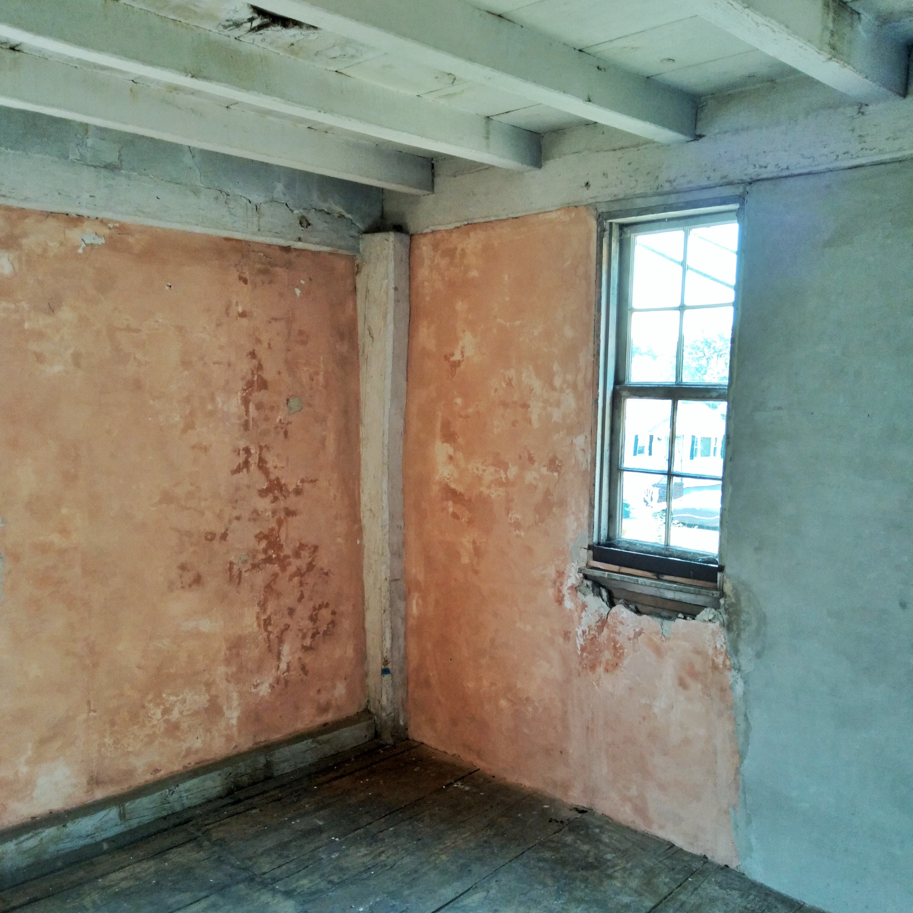 Let’s start with the beginning of the house. It was built using timber framing, a post-Medieval European technique where pegs made of soft woods like pine connected a pair perpendicular of notched beams made of hardwoods. These structures predate widespread usage of nails. Even with the nearby ironworks, metal was expensive and used sparingly on door hinges. Other features common in houses from this time period include rough, wooden clapboards on the exterior; a thick, wooden skirtboard on the bottom of the wall; and roof boards on the ceiling. Boardman House does deviate from common building techniques to the construction of its room. The builders used few rafters (large wooden beams making the peak of the roof) but many purlins (small wooden beams attached to the rafters and parallel to the floor).