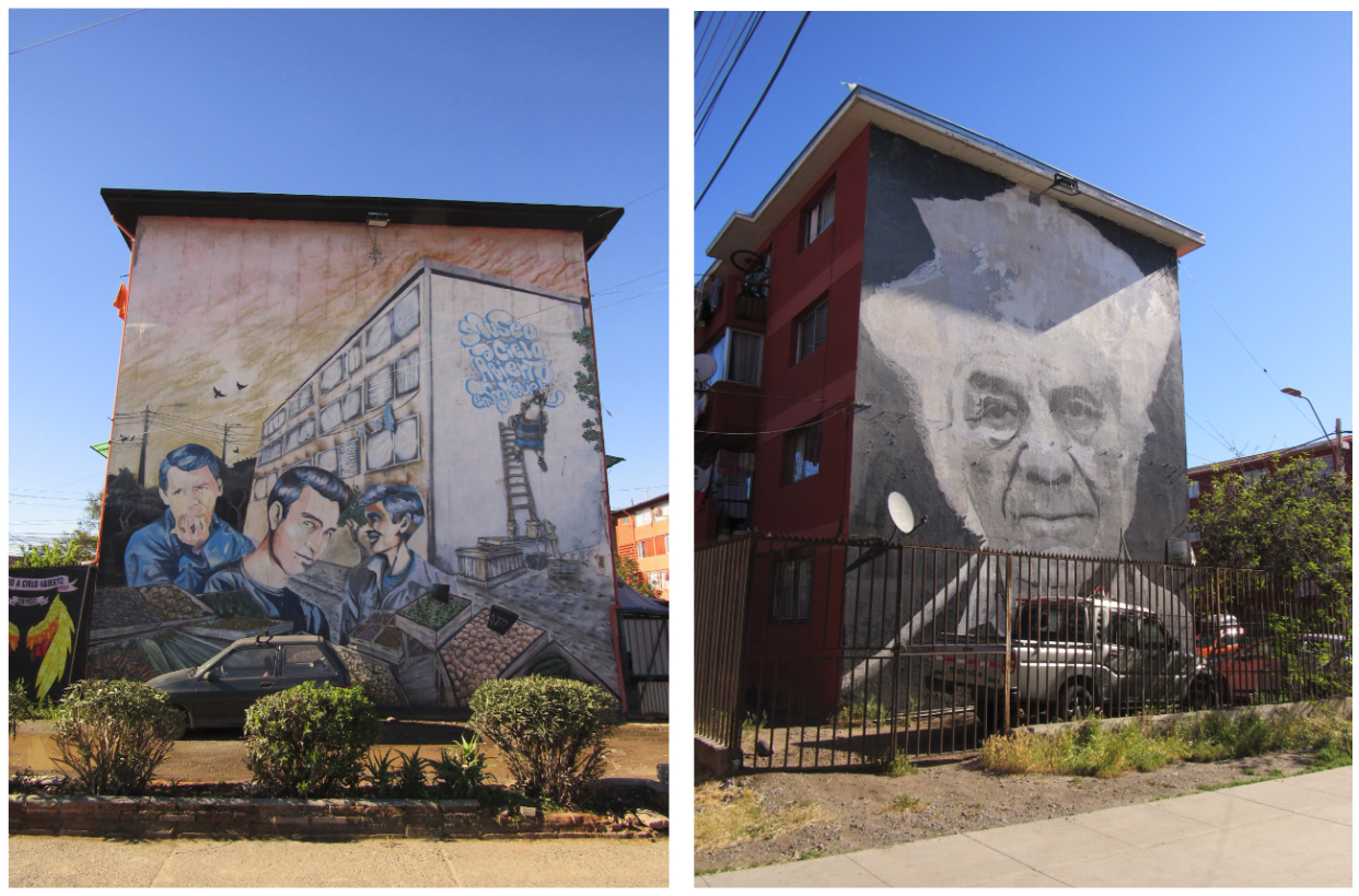 When we visited, we arrived by public bus along Avenida Departamental, already spotting murals through the window. Stepping off, we walked into the neighborhood between rows of apartment blocks and balconies. There was no sign announcing the museum and no clear entrance - only small plaques beside each mural indicating its title and author. There is no suggested route, no starting point, and no prescribed way of moving through the space. Afterwards we realized that maps of the Villa San Miguel and its murals are available at the corner of Avenida José Joaquín Prieto and Carlos Edwards, and where Tristán Matta meets Teodoro Schmidt.