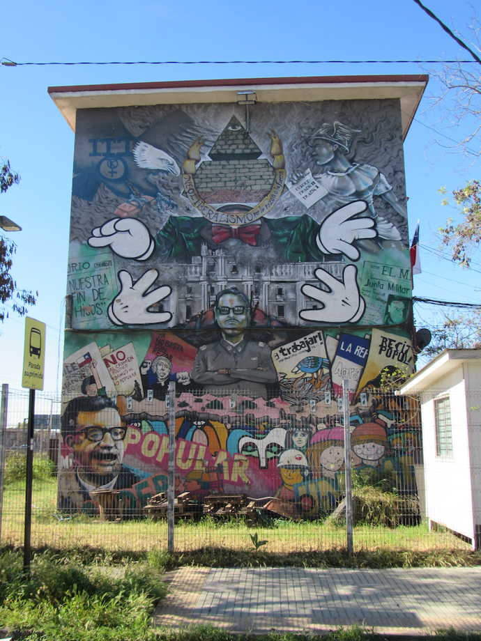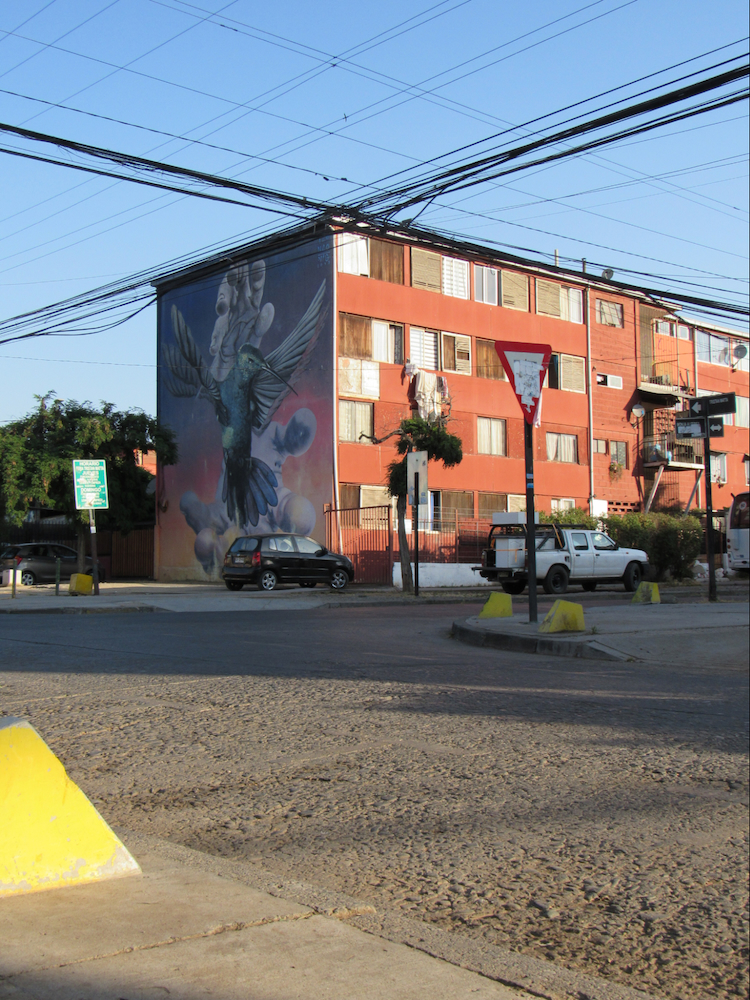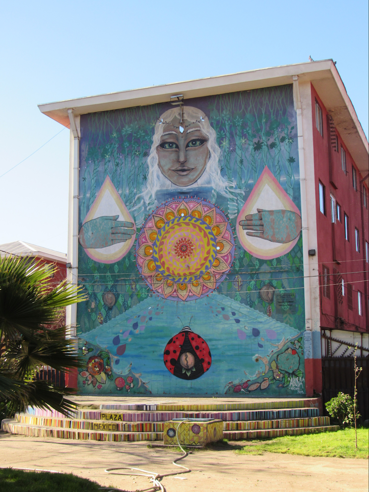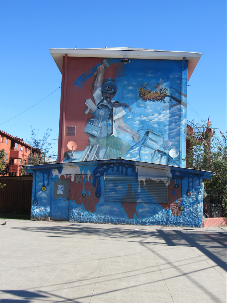 During your visit, you will encounter a wide range of motifs: national figures such as the music band Los Prisioneros - who originated in San Miguel - and the poet Nicanor Parra; and art that criticizes the dictatorial regime and the installment of neoliberalism in Chile. The artworks extend beyond the buildings to other infrastructures, benches, and plazas, using mosaics, recycled materials, and painted signage. For instance, a mural by Payo (Instagram @payosochting) representing the vibrancy and diversity of Latin America, was extended to the structure of a kiosk underneath it. These elements blend seamlessly with children playing, laundry hanging from balconies, and trees swaying in the wind.