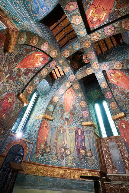 As I walk around the building and approach the main entrance, 15 more angels invite me in. Pushing the heavy oak door carved of dragons, it creaks, spookily. Then it hits me: a myriad of colour in gesso and ancient spiritual stories stretching upwards, deep into the distant dome, linked by the Tree of Life. My ghostly footsteps on the stone floor echo around and around.