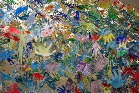 As you enter the building you are welcomed by a helpful volunteer, who will guide you towards the various exhibitions currently on show. Straight ahead is the staircase which leads directly to the two upper floors, and above it is an installation of handprints entitled ‘The Wave’. The handprints were collected during the early days of publicity for the museum and gallery when volunteers attended events in Woking and encouraged the public to ‘make their mark’ (while talking to them about the planned building) with the intention of the handprints being joined to surround the building on its opening: instead they were laminated and hang over the staircase.