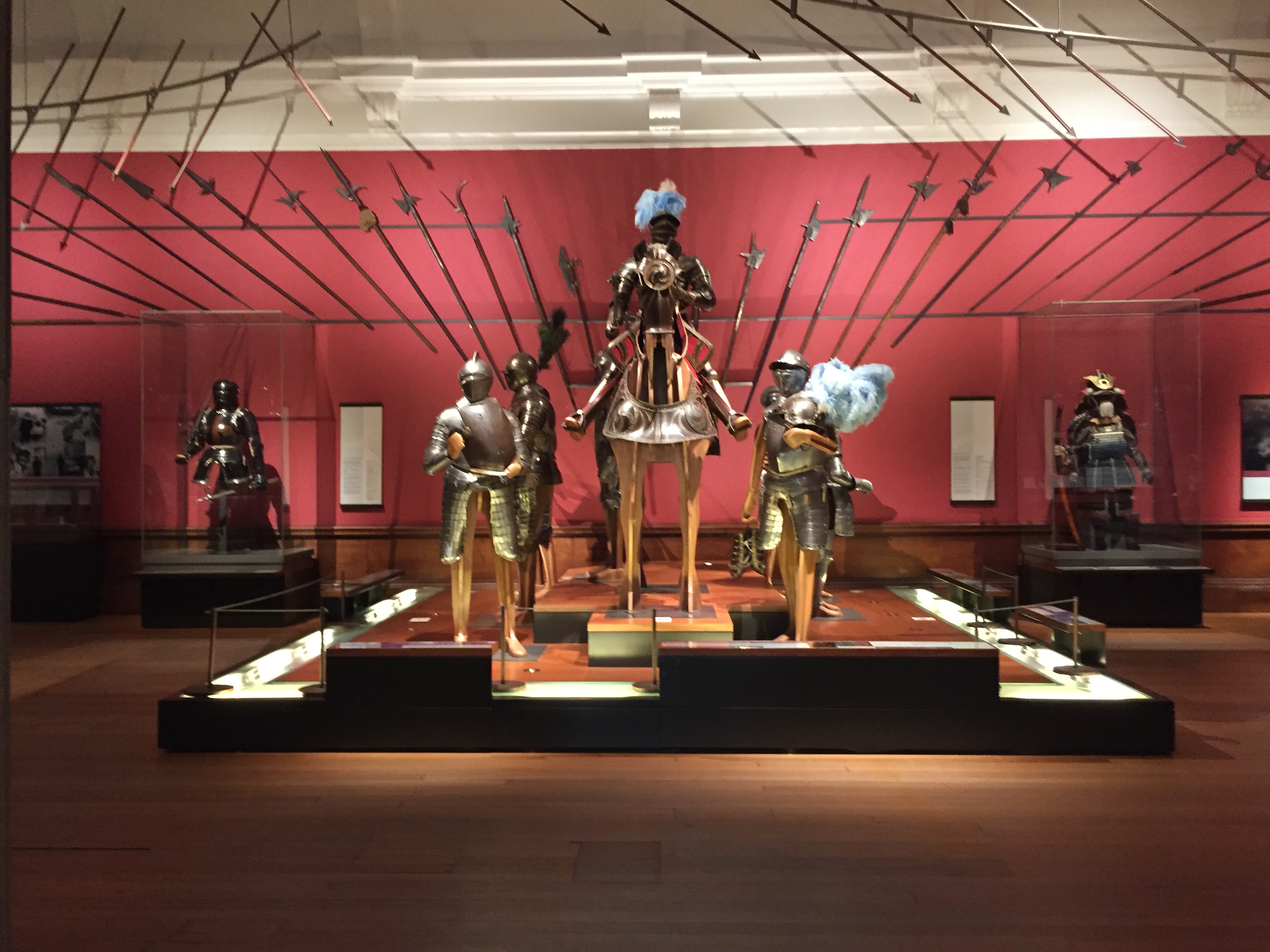 I ended my visit by exploring a bit of the first floor, having climbed the grand staircase which provides a spectacular view of the ground-floor court from above. ‘Conflict and Consequence’ welcomes visitors with an equally spectacular sight. Suits of armour flank the gallery’s entrance, where the viewer immediately comes face to face with a group of mounted knights and bladed weapons poised threateningly overhead. The knights’ armour, which includes sixteenth-century pieces made for the first Earl of Pembroke, illustrates the first story this exhibition wants to tell — namely, a warrior’s place in society.