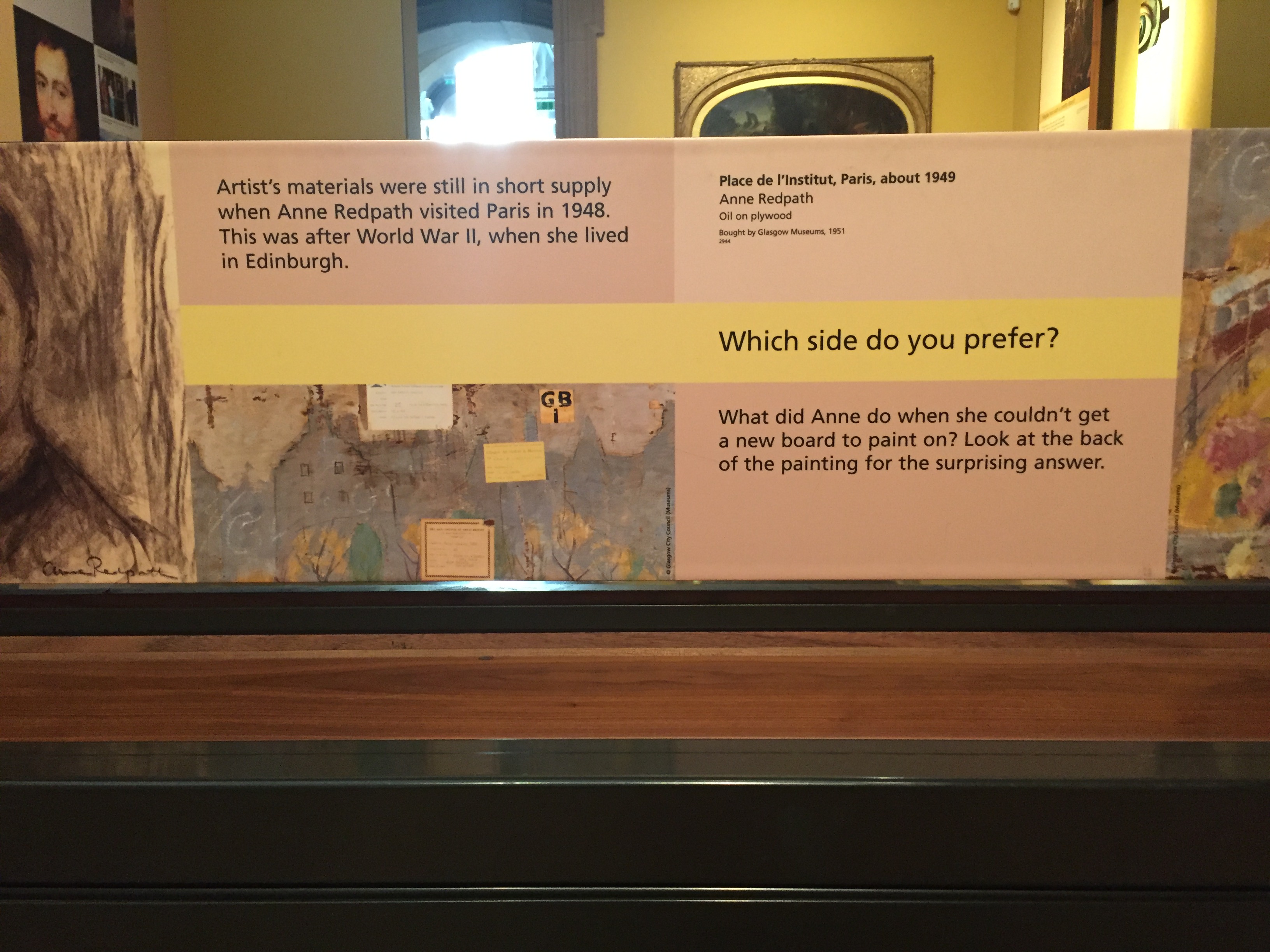Looking at Art, the first stop on my one-way route, seemingly compensates for the building’s overwhelming architecture by engaging visitors as much as possible. Upon entering the gallery, one comes face to face with a free-standing display wall which shows Norah Nilson Gray’s Girl with a Burmese Umbrella (c. 1925) partway through restoration. On either side of the framed picture, descriptive text explains in simple, informal language why and how the museum engaged in conservation work: ‘We were sure the colours would be lovely when it was cleaned.’ About a third of the painting is shown in its earlier discoloured state, as if an Instagram filter got stuck mid-swipe. Behind this first display, a large plywood piece by Edinburgh artist Anne Redpath (1895–1965) is encased in glass. The placard below the exhibit — so near the ground I had to crouch down to read it, perhaps at a child’s eye level? — prepares visitors for a surprise when they walk round to the other side. Short on materials, Redpath reused the plywood for a second painting.