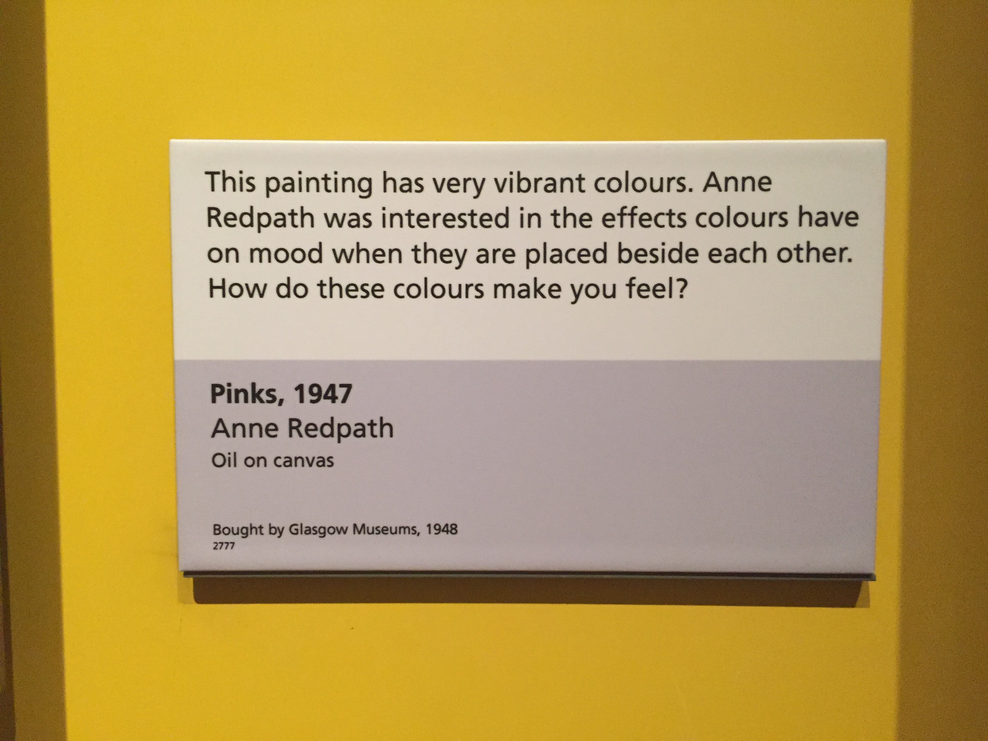 ‘Which side do you prefer?’ the placard asks. In this gallery, exhibition labels repeatedly address the reader. The tone and diction of these questions suggest they’re suitable for children, and although the ground floor’s Mini Museum (for under-5-year-olds) is unfortunately closed at this time, Kelvingrove’s youngest visitors seem to be very welcome here. Against a cheerful yellow backdrop, a display exploring various artists’ use of colour asks, ‘How do these colours make you feel?’ Looking at Art reaches out to viewers persistently, directly — it wants to know how we feel, what we like or dislike about the exhibits, how we respond to them, what we see. One vertical accompanying board declares its subject: The Art of Looking.
