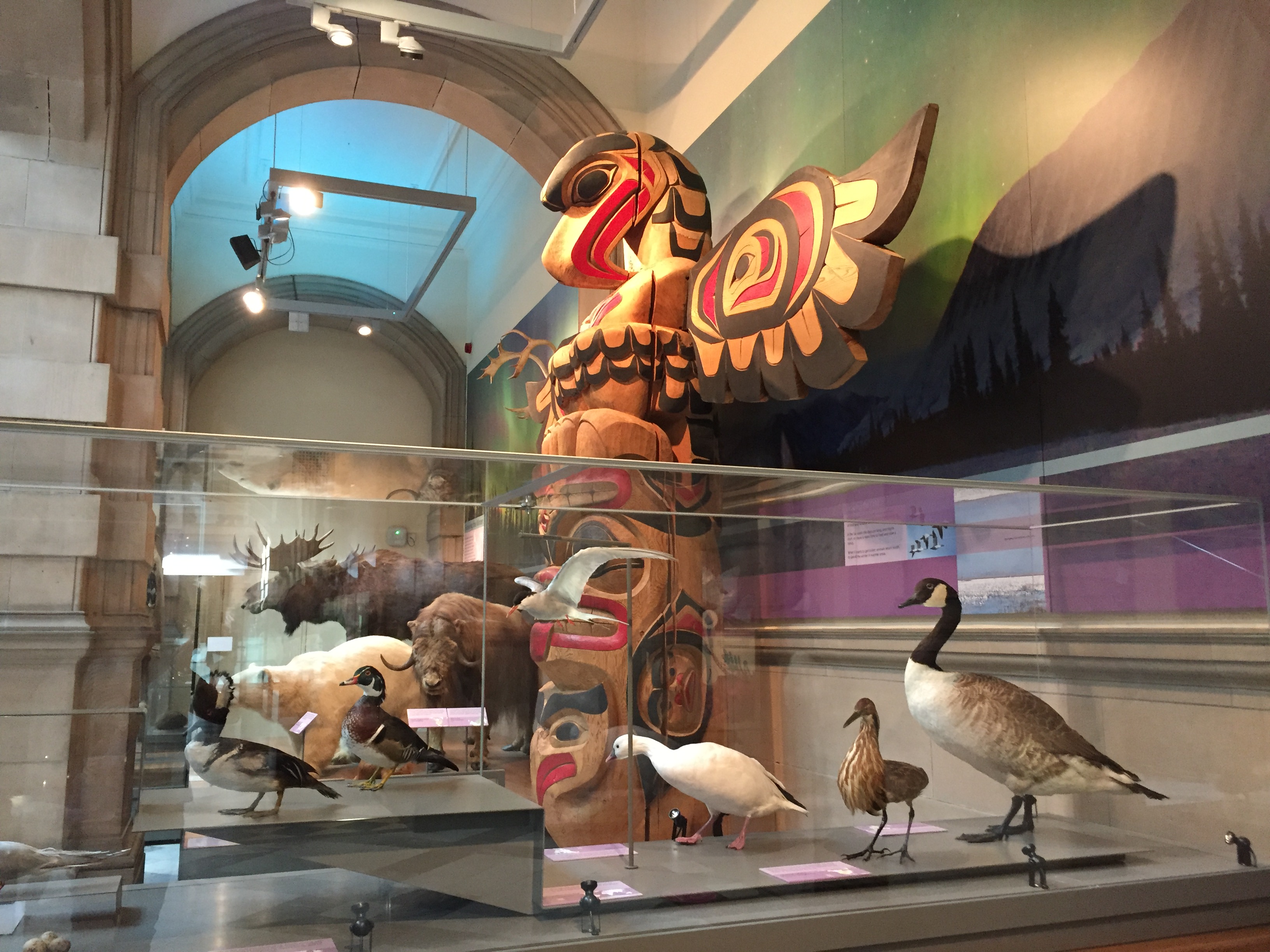 Kelvingrove’s strategic refusal to dictate ordered narratives didn’t take away from my experience. Visitors, after all, are capable of thinking for themselves. But there is one display choice which seems left over from the days of empire — the decision to include indigenous peoples’ cultural artefacts in a natural history exhibition. An eagle-headed Coast Salish totem pole, the work of First Nations artist Doug LaFortune, stands amidst taxidermy bird specimens. Carved from red cedar, the totem pole towers above its surroundings. When you enter via the designated pathway, however, it’s partially blocked by a display case so that you literally see it for the first time through a natural history filter.