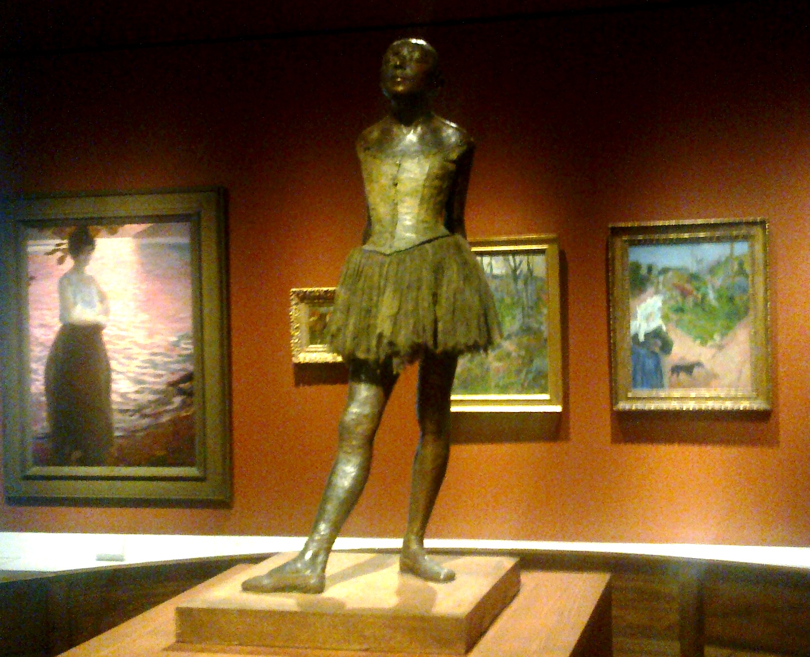 Level 1 of the Henning Larsen and Kampmann buildings are given over to French painting and the wide collection of French Impressionist work such as Monet, Rousseau, and Cézanne. The Impressionist group also contained a number of women artists and the American painter Mary Cassatt is featured with Julie with Her Nurse (1880) a good example of the women and child motif, common to her work. Berthe Morisot was taught to paint privately and in 1864 exhibited at the state sponsored Salon de Paris, before joining the Impressionists in 1874. Young Girl Braiding her Hair (1893) part of the museum’s collection was painted late in Morisot’s career, a few years before her death in 1895. In keeping with the Glypototek’s penchant for three dimensional works Edgar Degas’ famous sculpture of the dance student Marie van Goethem has pride of place in the French rooms. The original piece was sculpted in wax and exhibited at the sixth Impressionist exhibition in 1881. It received mixed reviews, the art critic and novelist, Joris-Karl Huysmans declared that it was the first truly modern attempt at sculpture I know, while Paul Mantz described it as the flower precocious depravity. The work at the Glyptotek is based on a later reworking of the wax sculpture which was cast in bronze during the 1920s.
