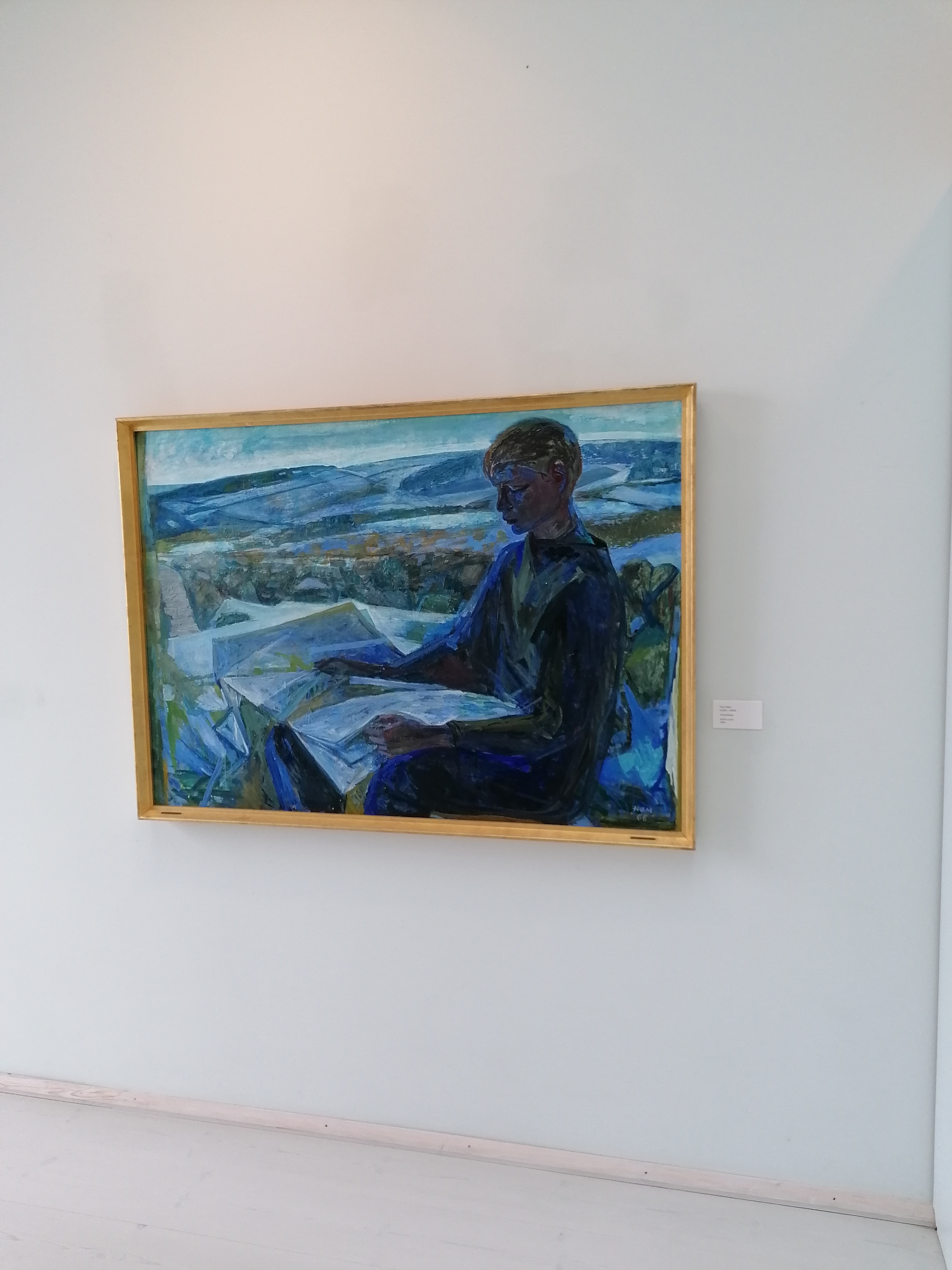 After paying the entry fee (which, admittedly, is quite expensive for people who are used to public galleries being free of charge), you begin your tour with Bornholm’s artistic past: Suddenly you find yourself in rooms that are painted in rich colours, with creaky floorboards instead of the cold stone the museum seemed to have been made out of. The “Danish Golden Age” paintings from great artists like Lars Hansen (1813-1872) and Kristian Zahrtmann (1843-1917) mostly show still lives and portraits. Especially Zahrtmann is shown a lot in the permanent collection, and his painting Det mystiske bryllup i Pistoia (1894) makes up one of the highlights one can spot while wandering around the permanent collection. Other artists, such as Vilhelm Petersen (1812-1880) depict Bornholm’s landscapes in diverse, mystic and dramatic ways, inspired by the German philosophy movement of Sturm und Drang (following the Enlightenment period). As you walk along the rooms showing paintings of the landscape, the museum breaks the wall of depiction and real life by offering views through painting-sized windows. This is what has always made the museum quite endearing for me: Next to arguably very dark, mystic depictions of the rough sea, you can watch cattle sleeping outside and look at the “real” sea yourself.
