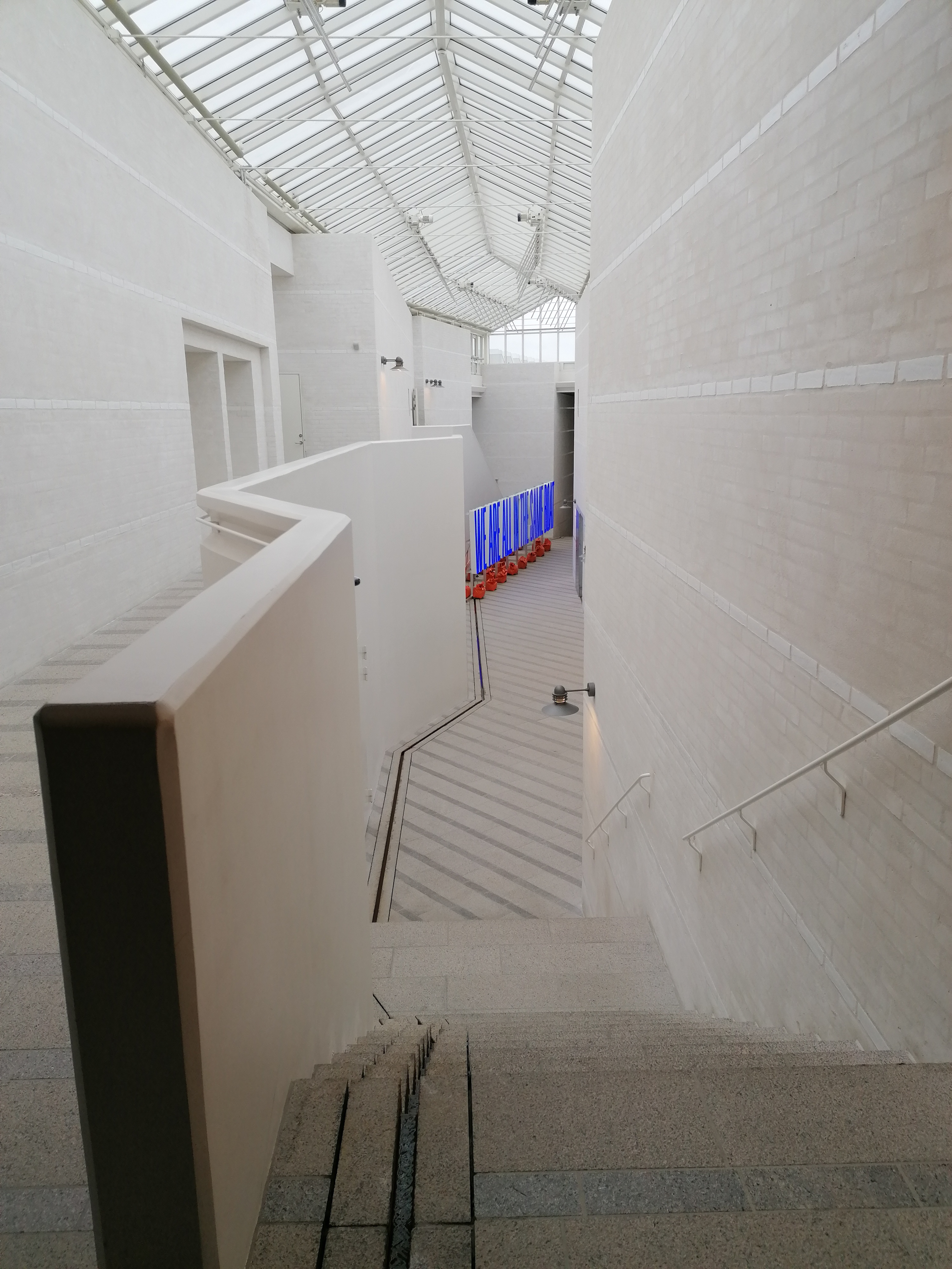 Upon entering, one is encapsulated by the interior: White-washed walls meet stone floors, bridges connect rooms on both sides of the building, a staircase leads the way downstairs. Sometimes you hear a film playing in the cinema room (as a child, I would always love to see Krtek the mole, but you can request other genres at the reception desk!). What has always sparked great joy in me is the spring that flows through the museum. Starting at the entrance, going down the staircase and ending at the back doors, it seems to lead the way and shows once again how connected the Bornholm islanders are to the natural wonders that surround them at all times: Instead of burying it under concrete, the Bornholm Art Museum decided to keep this sacred spring that gave the Sanctuary Rocks their name.