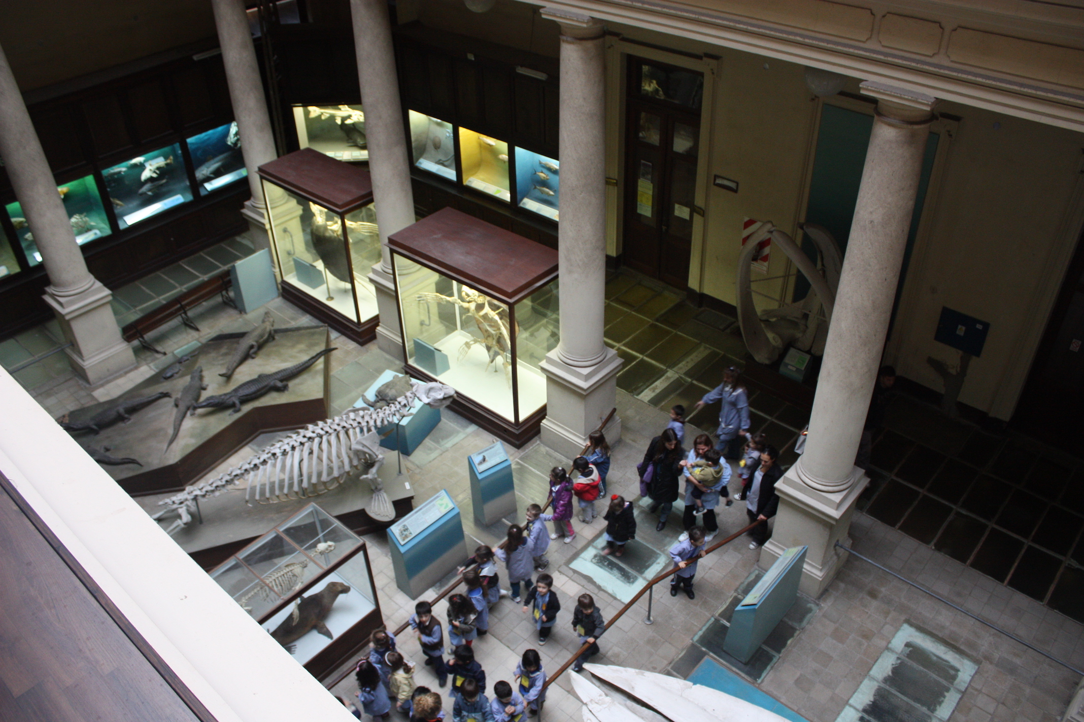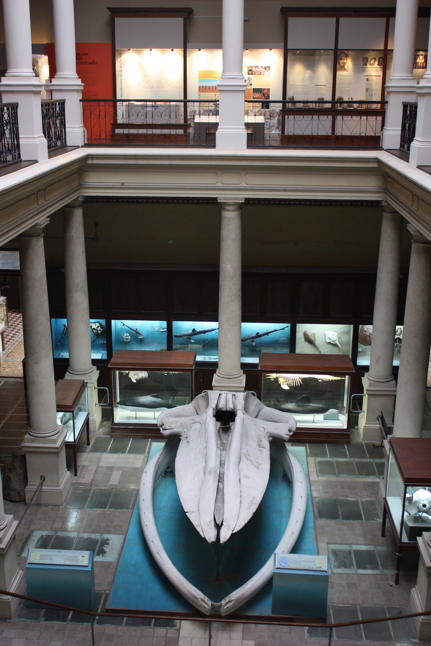 Visitors senses, possibly lethargic before the monochrome immobility of invertebrates, are assaulted by a universe of shapes and colors. To the left is the aquatic and semi-aquatic vertebrate hall. On the side walls are skeletons of various freshwater and marine fish along with information regarding their sporting and economic importance. In the central part there are skeletons, reproductions and embalmed bodies of sea lions, turtles, penguins and elephant seals. Undoubtedly the main attractions are the skull of a sperm whale on one side and the huge blue whale skull that occupies the center of the hall. In this hall there is also the entrance to the imposing library of the museum, which in its beginnings served as an amphitheater for presentations and lessons.