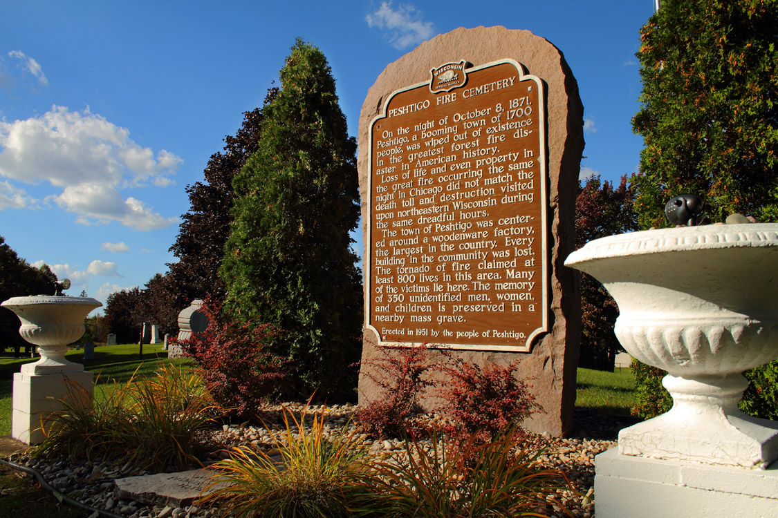 Adjacent to the museum is the Peshtigo Fire Cemetery, where many victims lie interred. In the cemetery is a mass grave containing the “ashes, bones, and bodies” of approximately 350 unidentified souls who perished that night. Many of the graves throughout the cemetery also contain informational plaques informing about their plight. The cemetery is on the National Register of Historic Places and contains Wisconsin’s first official State Historical Marker, placed there in 1951.