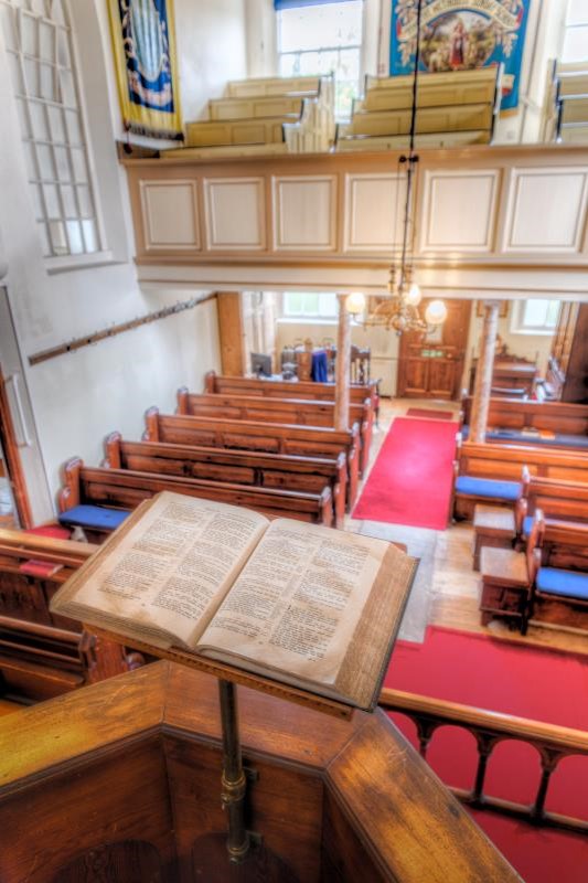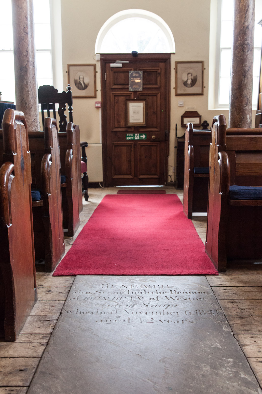 As you go further into the Chapel you will find a staircase up to the gallery, where you can look across the Chapel to the large windows above the pulpit. Back down on the ground floor, as you walk towards the pulpit, you will find a gravestone in the floor marking the resting place of John Dean of Weston. It is extremely rare for a grave to be found within a Methodist chapel. At the time Dean died the Parish of Weston would not allow him to be buried in the Parish church graveyard due to the established Church’s distrust of the Prims.