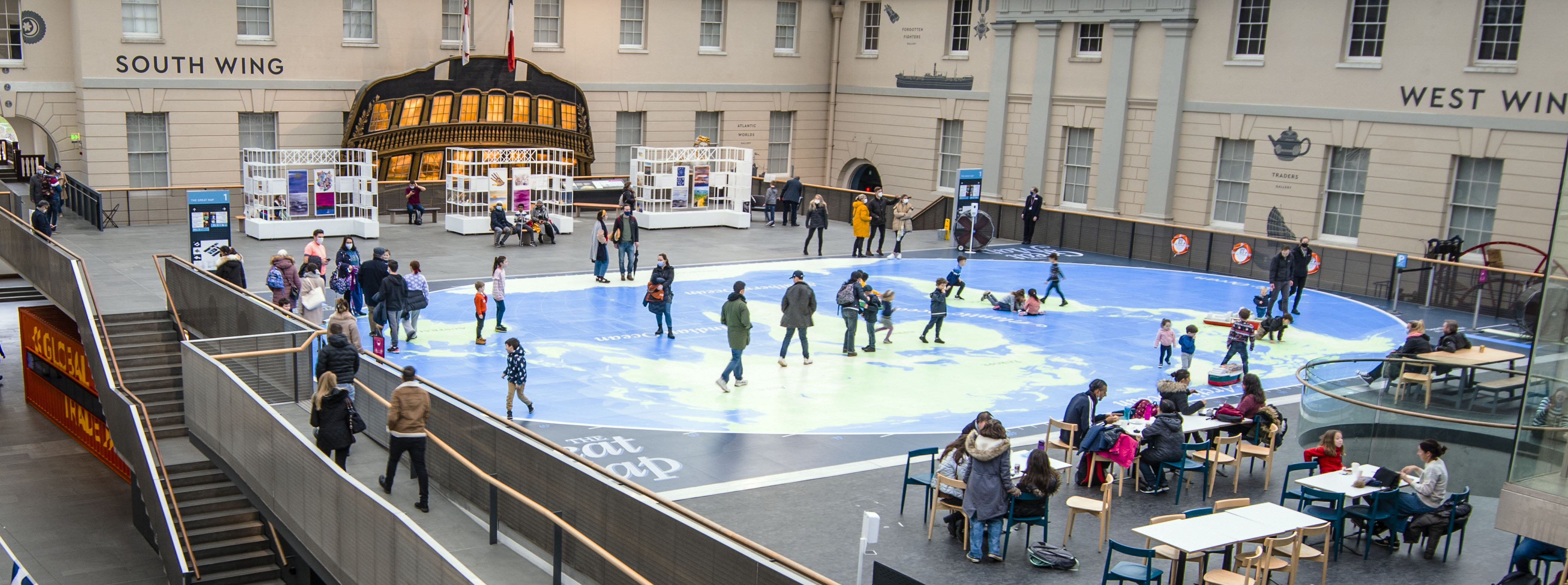 The huge first floor world map for children, right by the café, shows the trading routes of British ships around the world and over the centuries (see image at top). A delight!