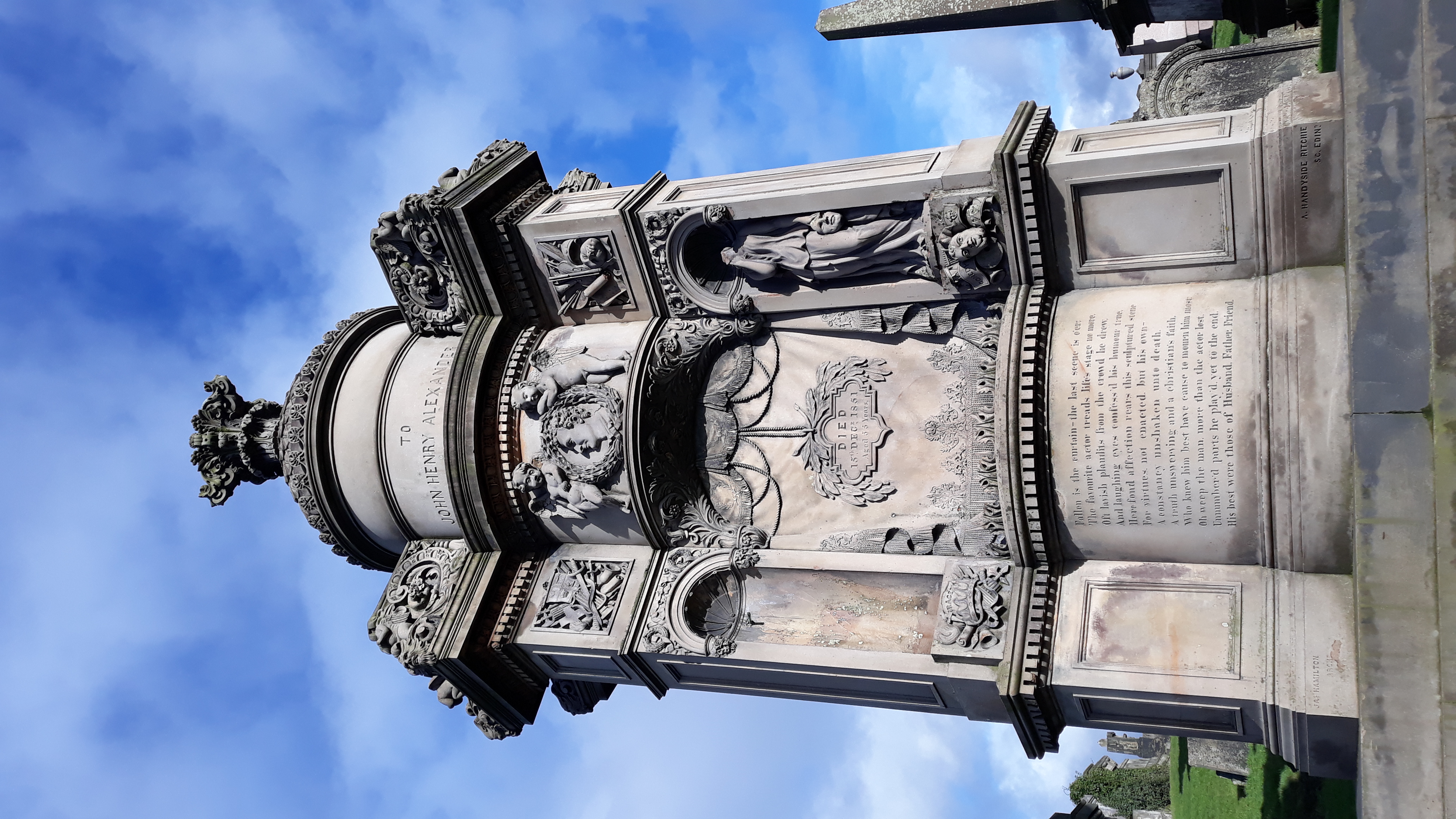 The Necropolis itself is a remarkable mix of fascinating architectures (mainly Classical Revival architectural fashion, sculptures with approximately 3500 tombs being built along the centuries. It is estimated that around 50,000 burials took place. Some famous individuals include several Lords Provosts (Peter Clouston 1800-1888; Sir William Collins 1817-1895; Henry Monteith 1764-1848 among others), engineers & shipbuilders (John Elder, John Inglis, Alexander Stephen), historians such as William Burns (1809-1876).