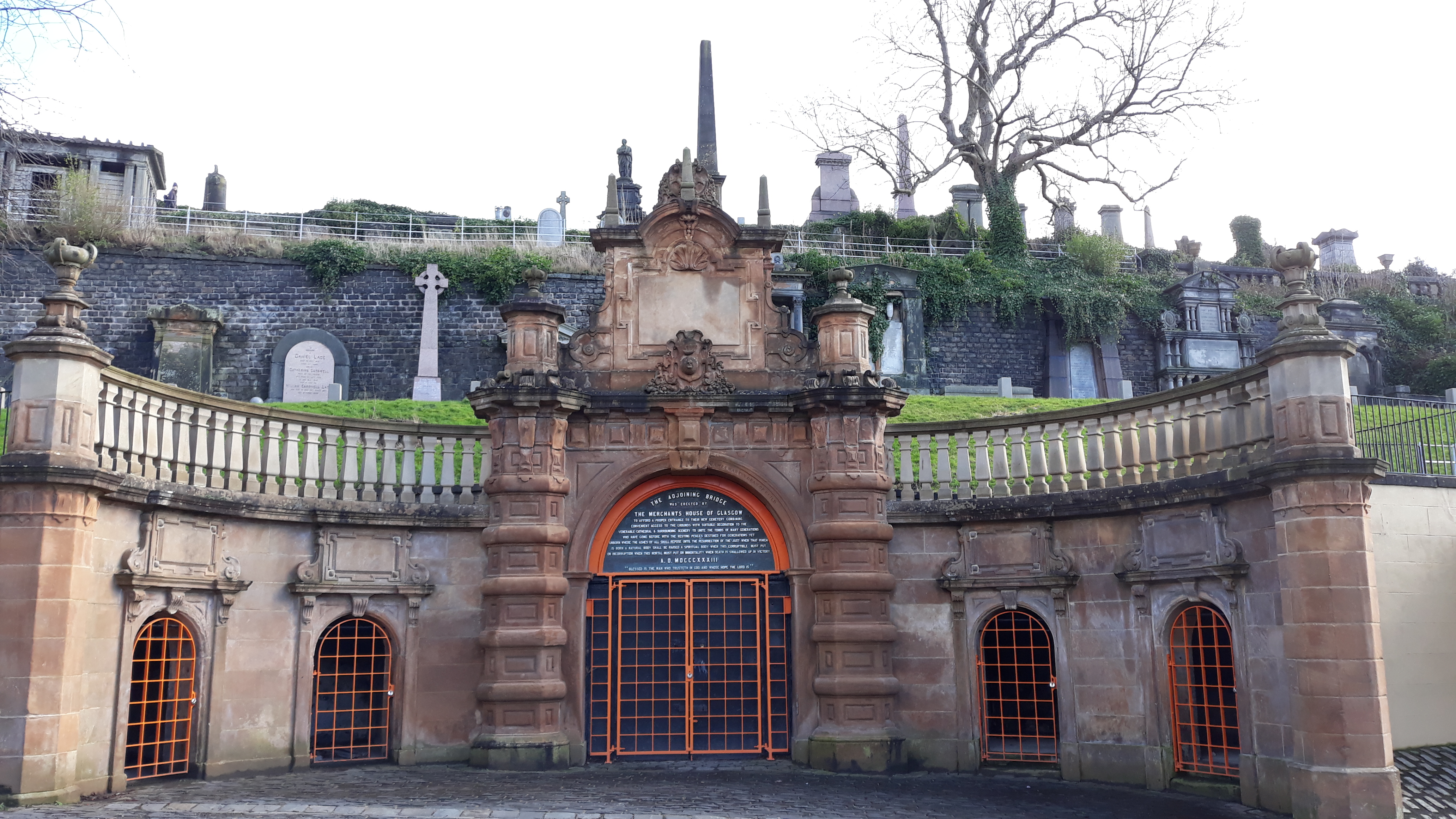 “The adjoining Bridge was erected by the Merchants House of Glasgow to afford a proper entrance to their new cemetery combining convenient access to the grounds with suitable decoration to the venerable cathedral & surrounding scenery to Unite the Tombs of many generations who have gone before with the resting places destined for generations yet unborn, where the ashes of all shall repose until the resurrection of the just when that which is born a natural body shall be raised in a spiritual body when this corruptible must put on incorruption when this mortal must put on immortality when death is swallowed up in Victory.”